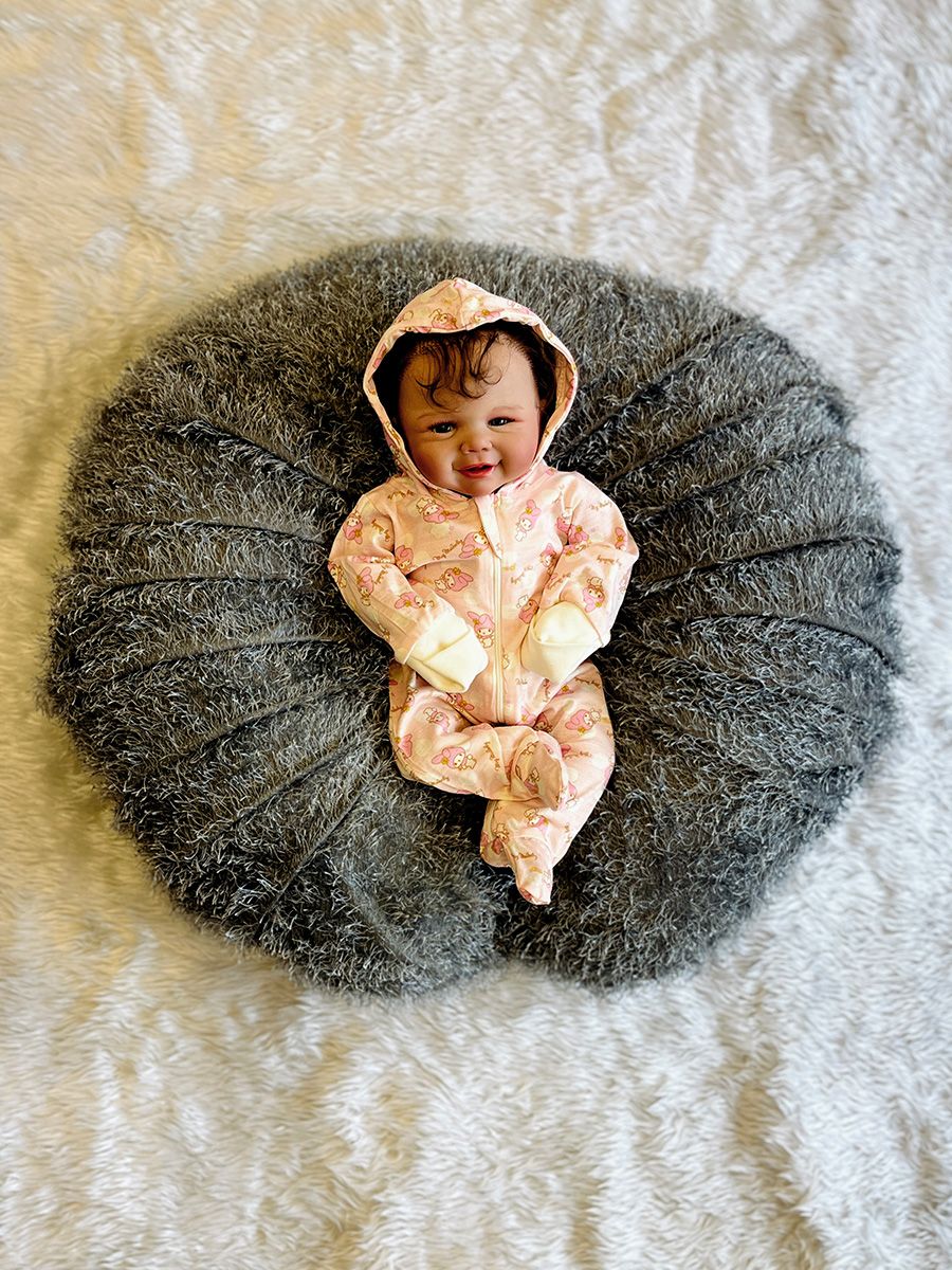 A pink color printed soft and stretchy knitted hooded design. zip-up front closure for easy changes. Lond sleeves with fold-over cuffs and hem for customizable fit. Integrated bootie design for warmth and comfort.