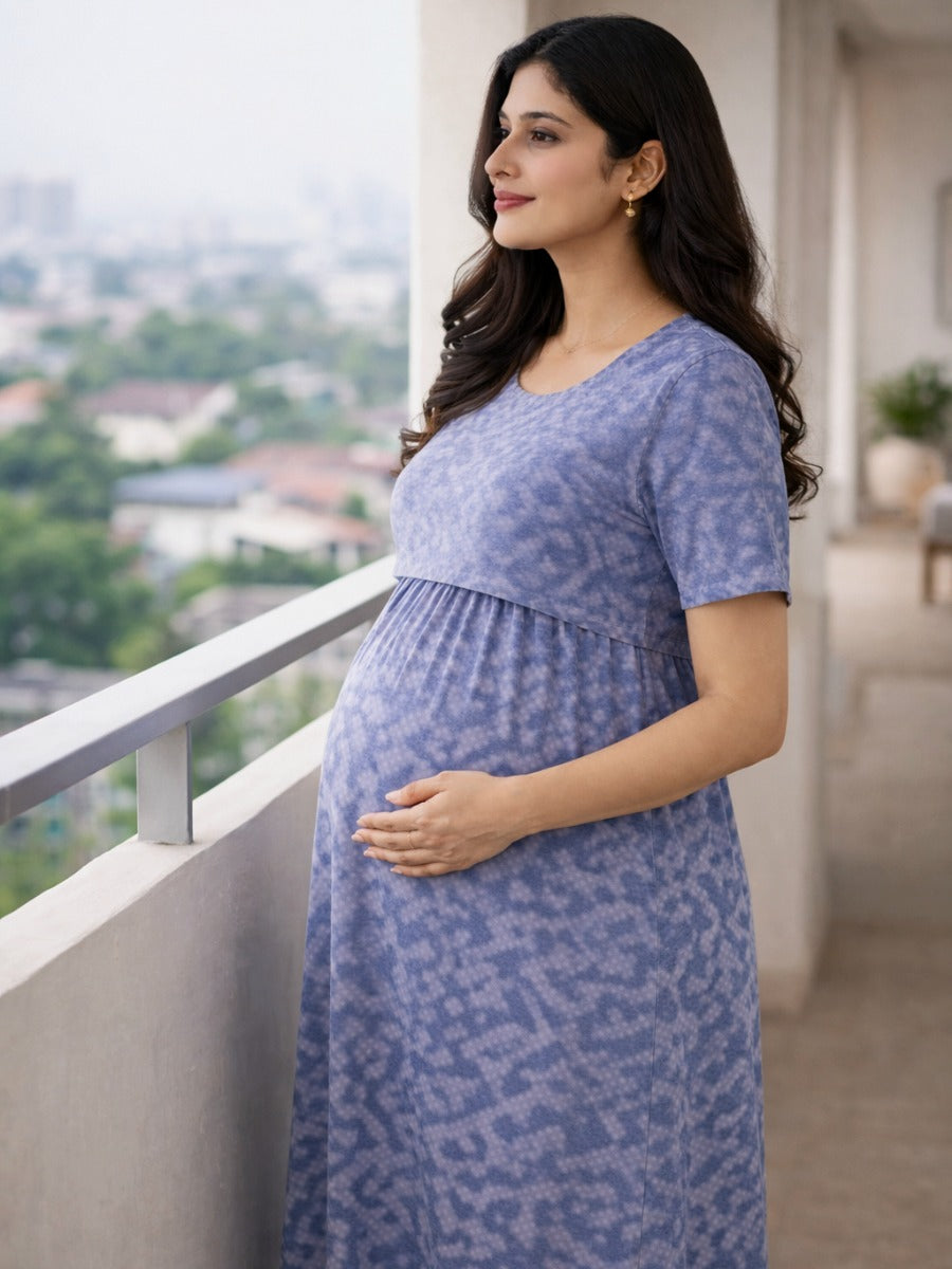 Add comfort and effortless style to your maternity wardrobe with this beautiful blue maternity and nursing dress, designed especially for expecting and feeding mothers. The dress features a vibrant all-over geometric tie-dye print on a soothing blue base, giving it a modern and stylish appearance.