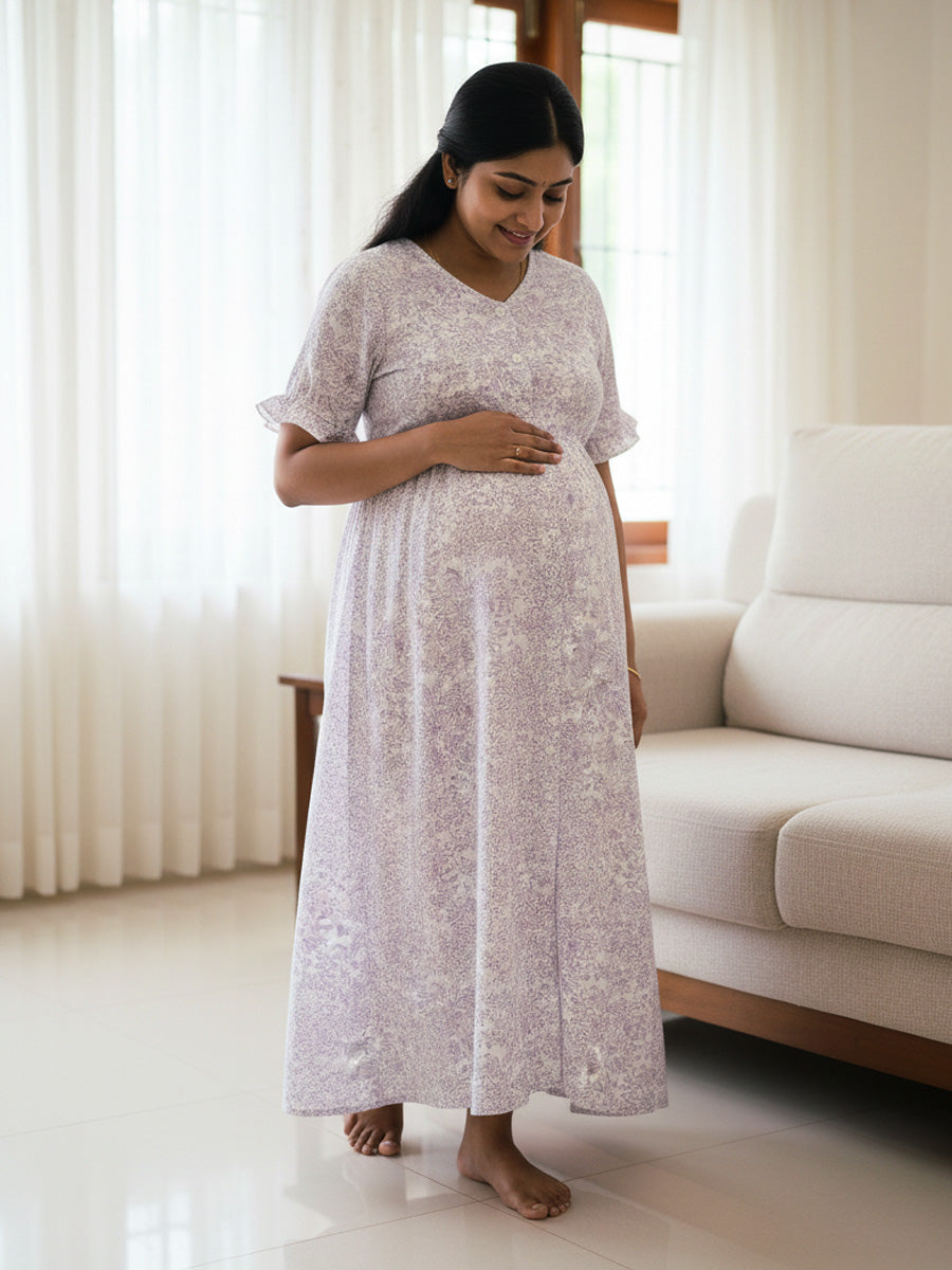 Crafted from 100% breathable cotton, this full-length nighty features a soothing white and lavender floral print that feels gentle on sensitive skin. The full open front with a V-neck ensures easy feeding access, while the smocked (smoking) waist design provides a flattering fit without restricting movement.