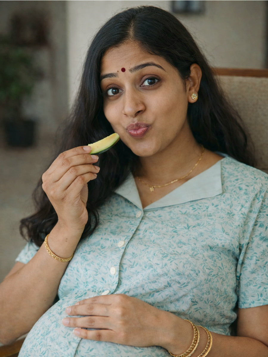 Designed with a full button-down front, it provides easy and convenient nursing access, making feeding simple and stress-free. The elegant camp collar neckline, soothing light blue-grey shade, and delicate floral print add a graceful touch to everyday maternity wear.