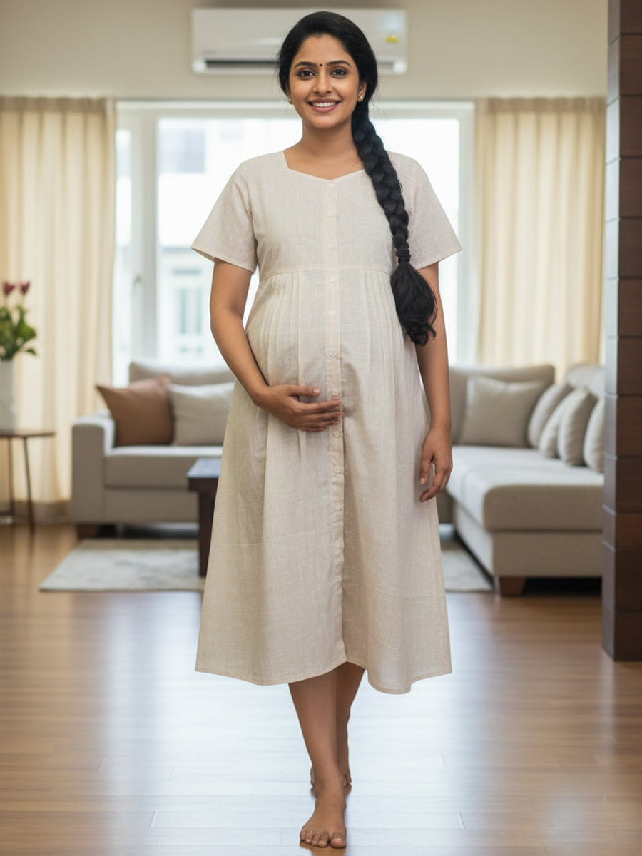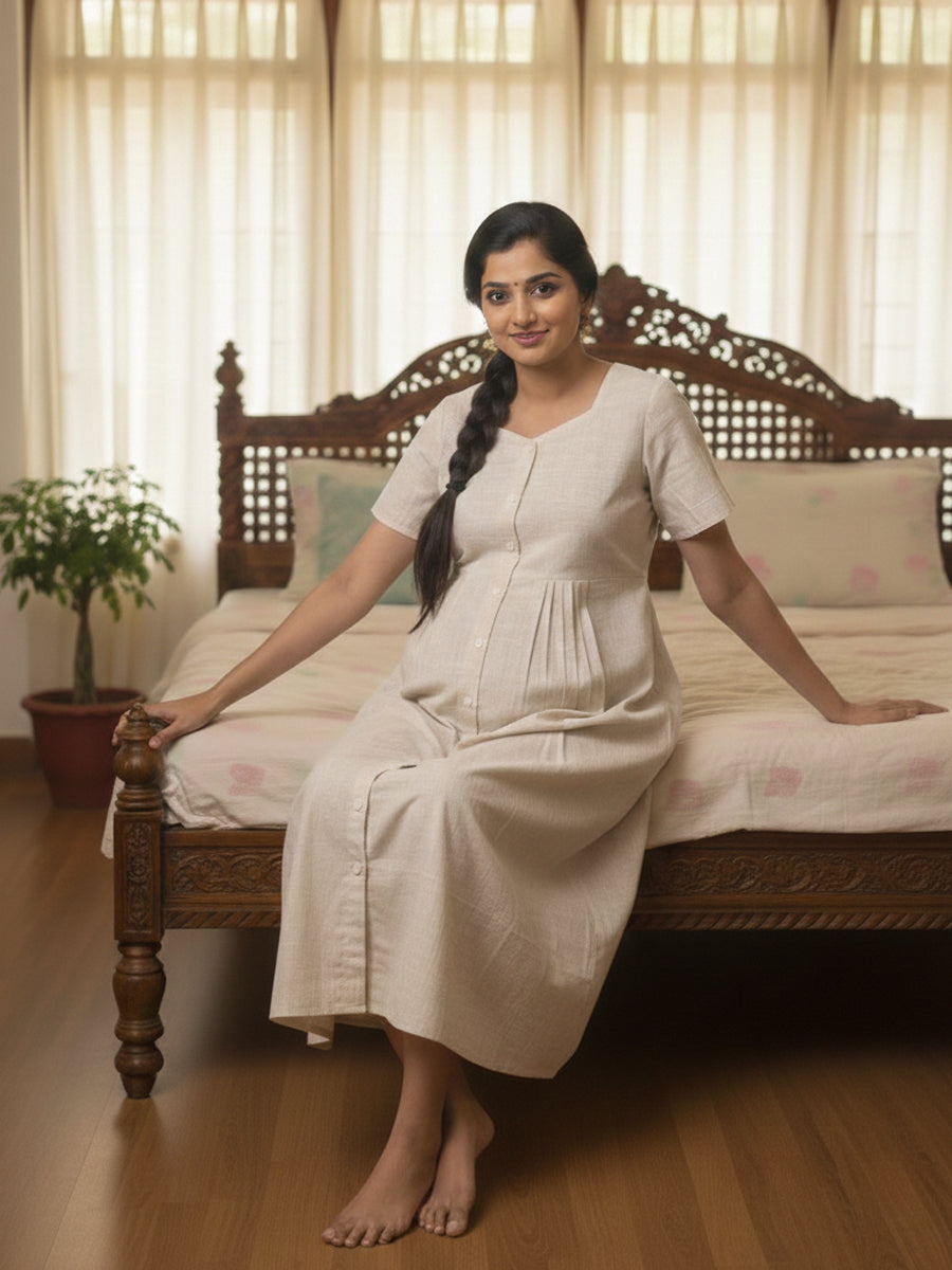 The sweetheart neckline adds a graceful touch, while the full-open front with matching buttons ensures hassle-free nursing and easy dressing. Side pleats and an adjustable waist tie provide a flexible fit that comfortably supports a growing belly. With regular half sleeves and a relaxed short length, this nighty is a practical and stylish essential for expecting and new mothers.
