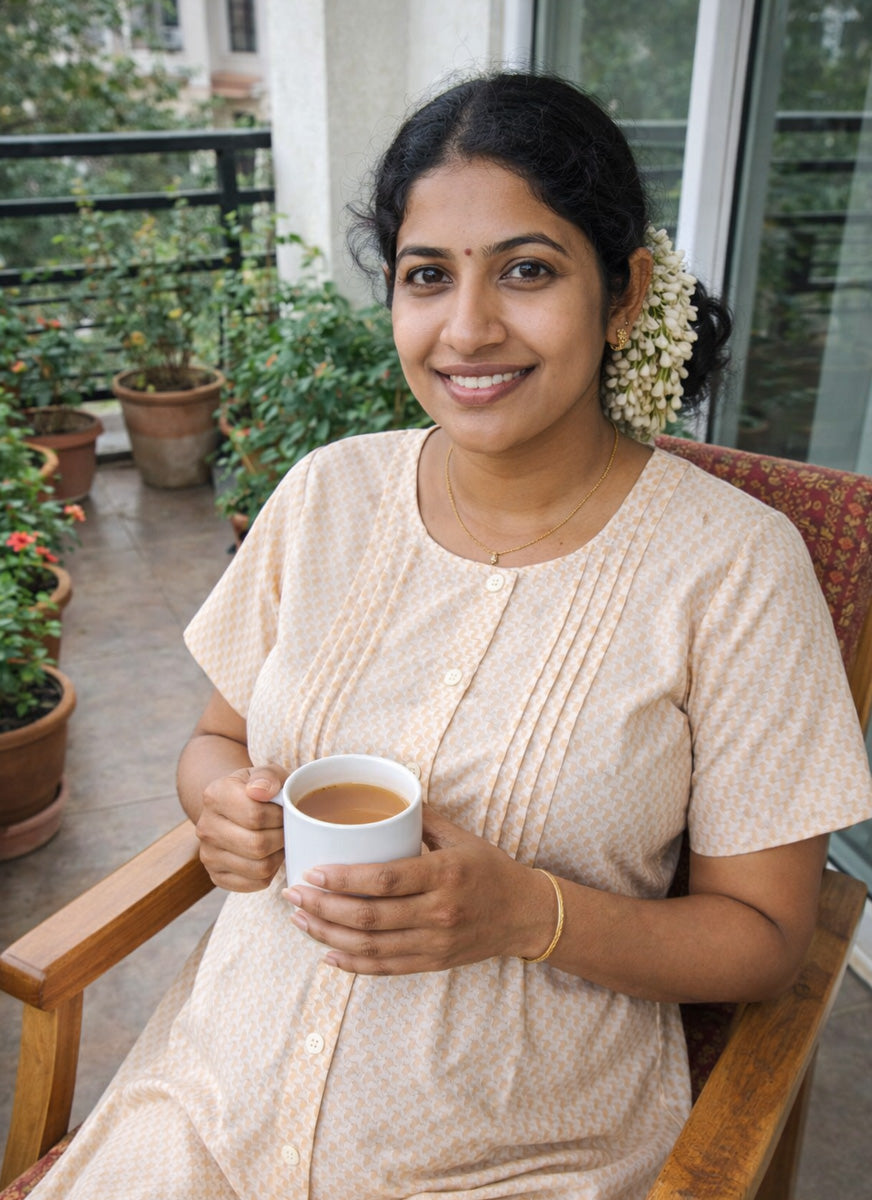 This cream cotton short nighty is designed for comfort and convenience during maternity and feeding. Featuring a subtle geometric print, it comes with a round neckline, half sleeves, and a full-length button placket with white buttons for easy nursing access. The vertical pin-tucks on the bodice add elegant detailing, while the adjustable waist tie provides a comfortable and flattering fit. Made from lightweight, breathable cotton fabric, this full-open nighty ensures all-day comfort for feeding mothers.
