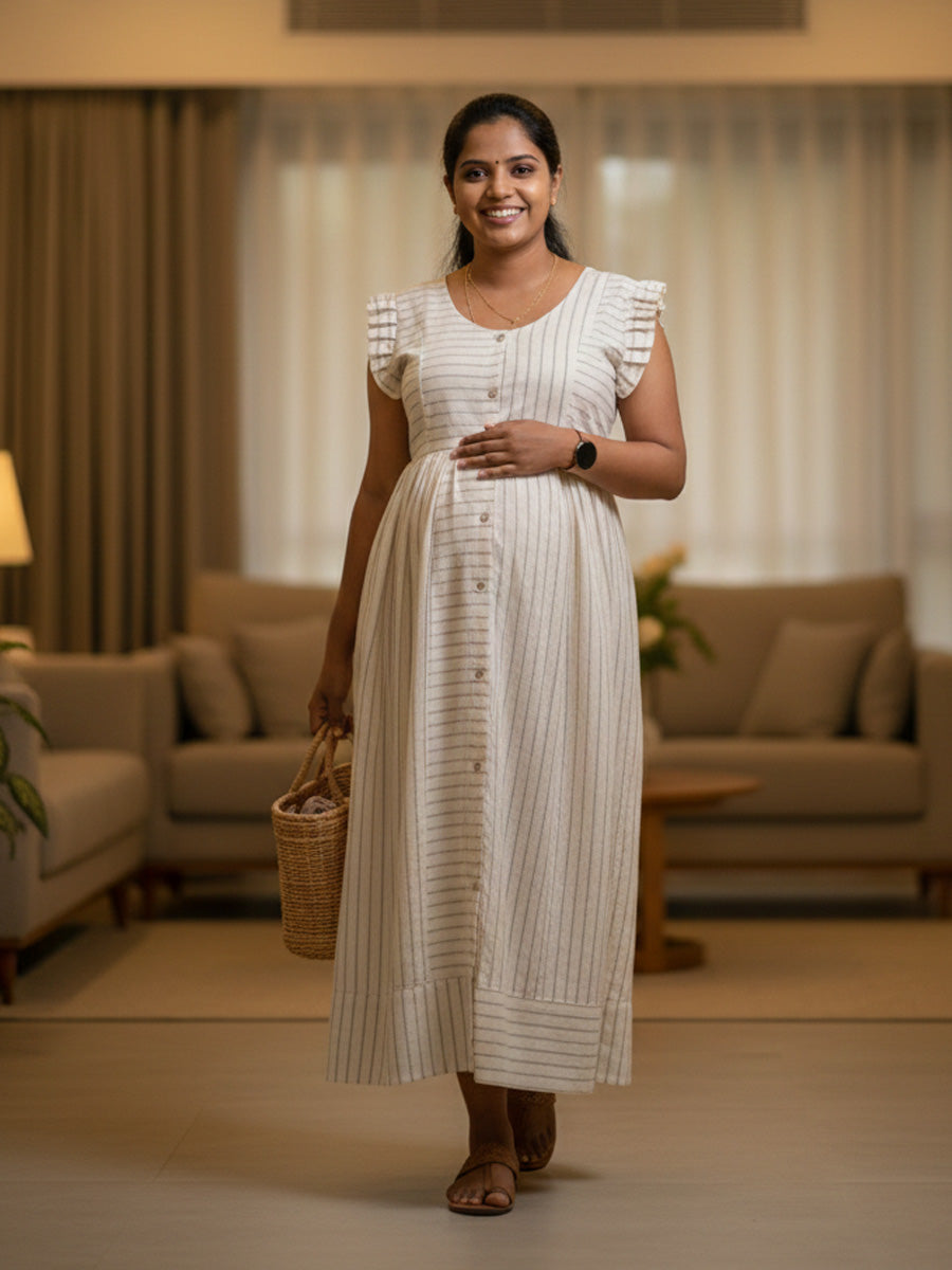 This cream organic cotton maternity and feeding dress is designed with elegant fine black stripes created using positive eco-prints. The body features thin vertical stripes, while the pleated cap sleeves and bottom border present a stylish horizontal contrast.