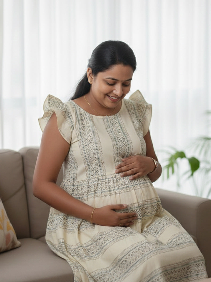 Designed with mothers in mind, the dress features concealed dual feeding zips for quick and discreet nursing wherever you are. For added practicality, it includes a side pocket—perfect for keeping essentials close. The elegant cream base paired with a stylish tribal print completes the look, making it a must-have for every mom.