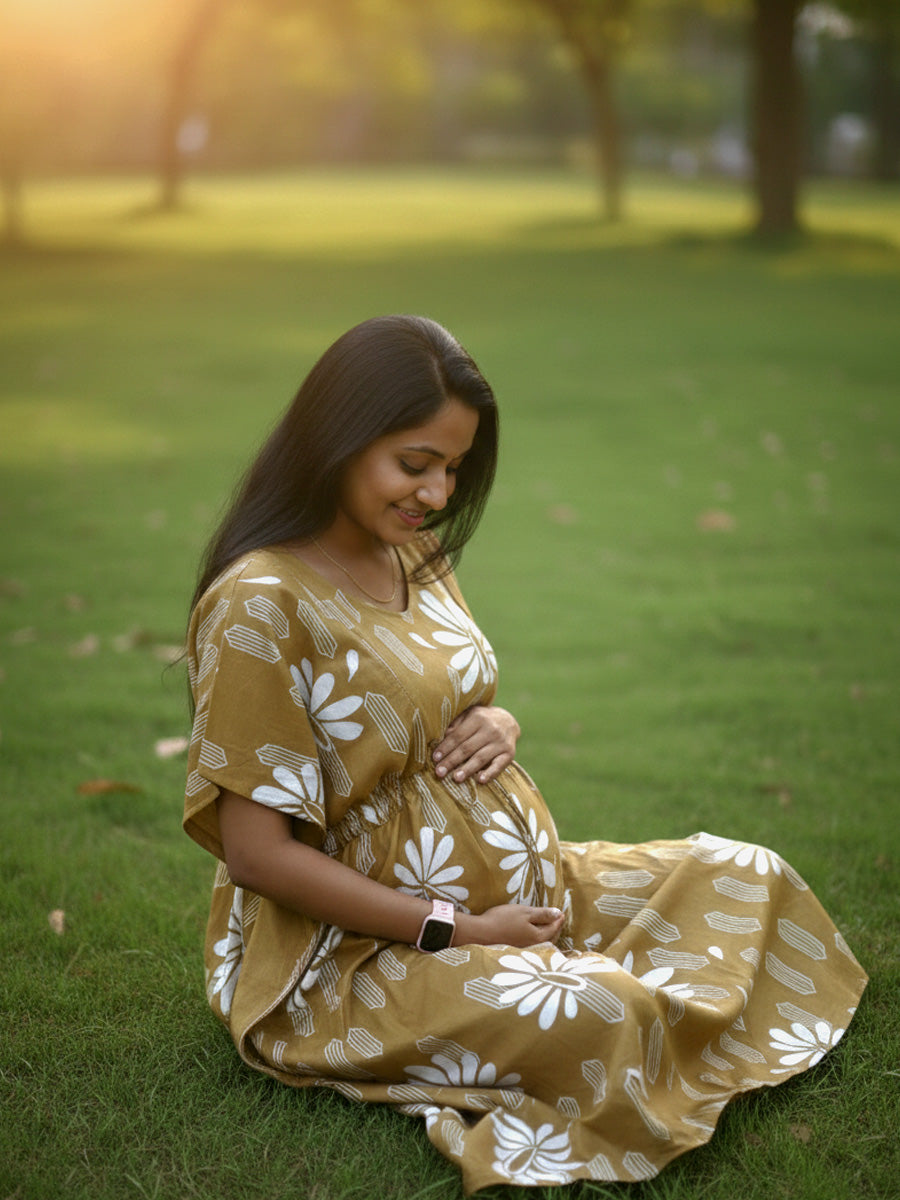 Experience effortless style and comfort with the Golden Brown Floral Premium Maternity & Nursing Kaftan by Ziva. Made from soft, breathable rayon fabric, this kaftan features a delicate white floral print on a warm golden brown base, creating a sophisticated and timeless look.