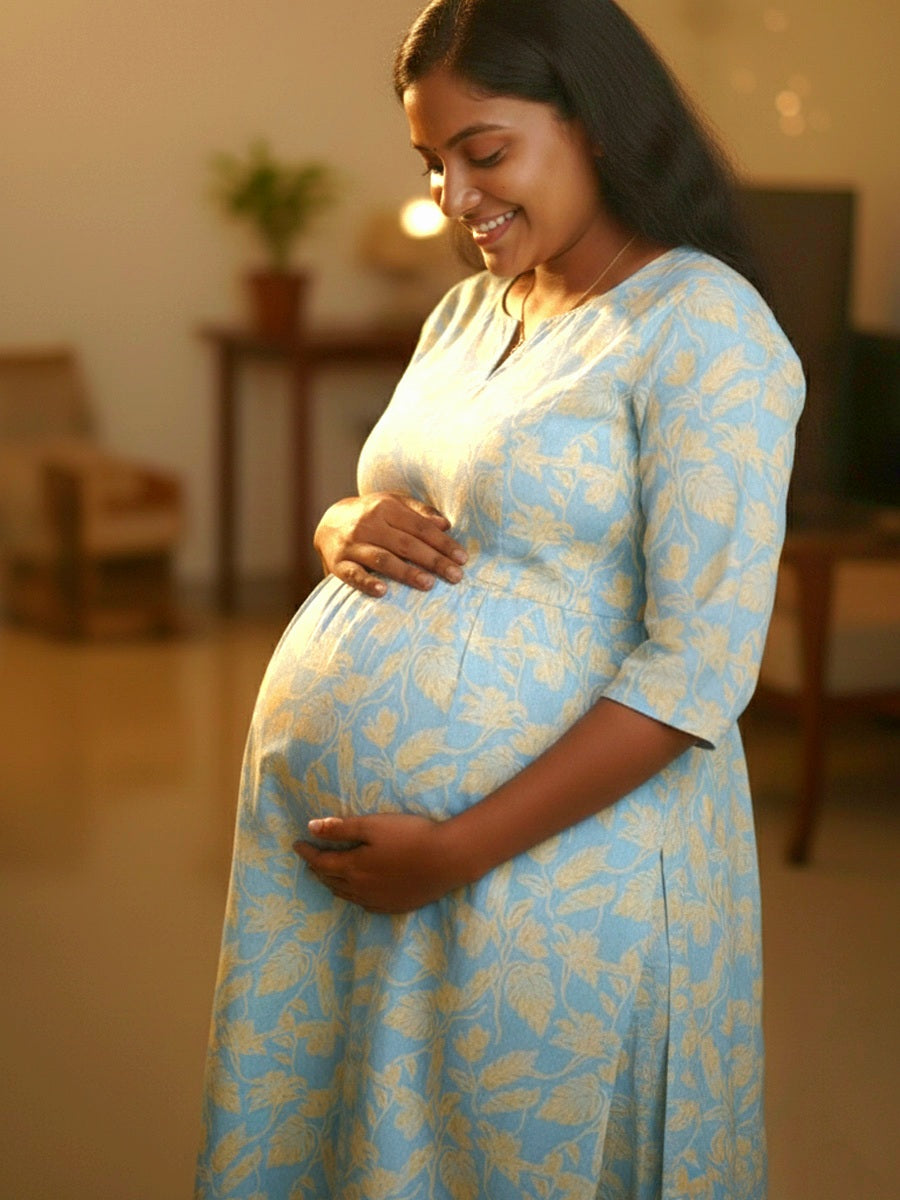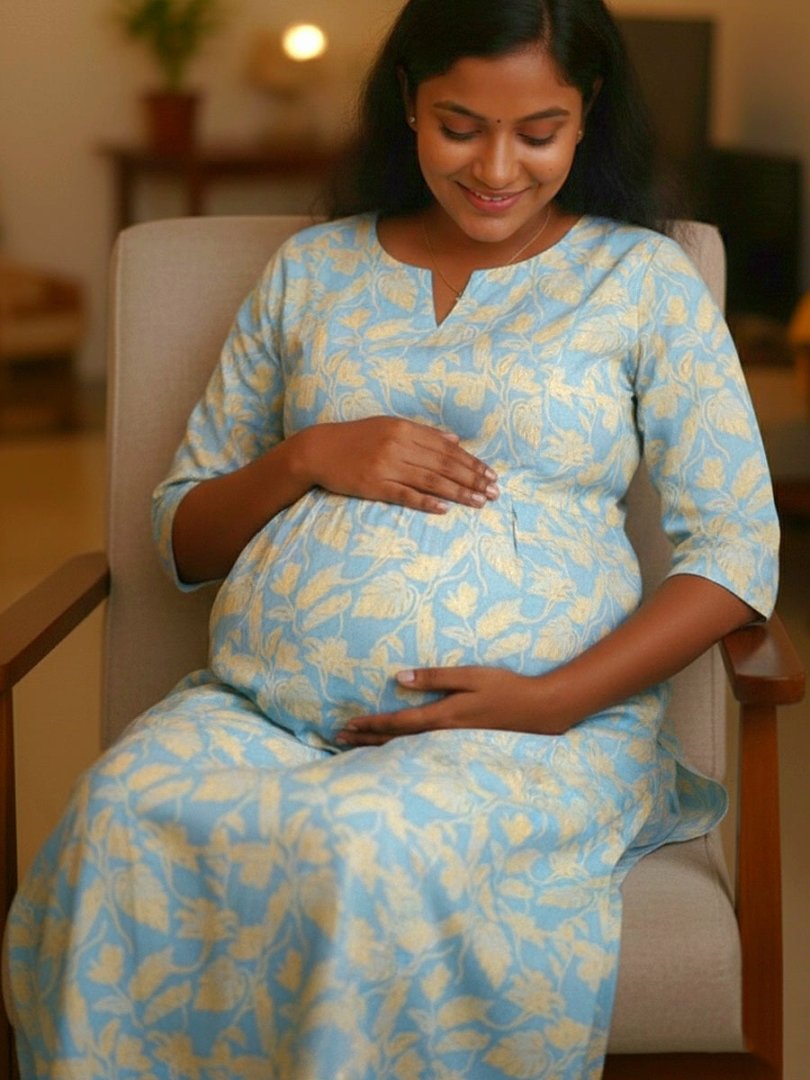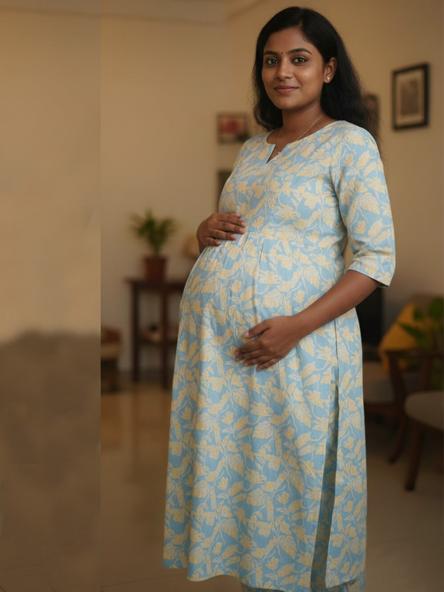 It pairs with coordinated printed trousers, offering a complete, comfortable, and stylish look for pregnancy, postpartum, and beyond.