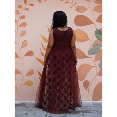 This elegant baby shower gown is designed to exude grace and sophistication. Crafted with a combination of embroidery net and plain net, it features a beautifully detailed yoke, where one side is adorned with intricate embroidery net, while the other side is elegantly finished with pleats. The skirt portion is designed with two layers— the first layer showcases an A-line cut in exquisite embroidery net, while the second layer is crafted with soft gathers in plain net, adding volume and a dreamy effect. The bottom is delicately finished with a baby lock, ensuring a flawless and refined look