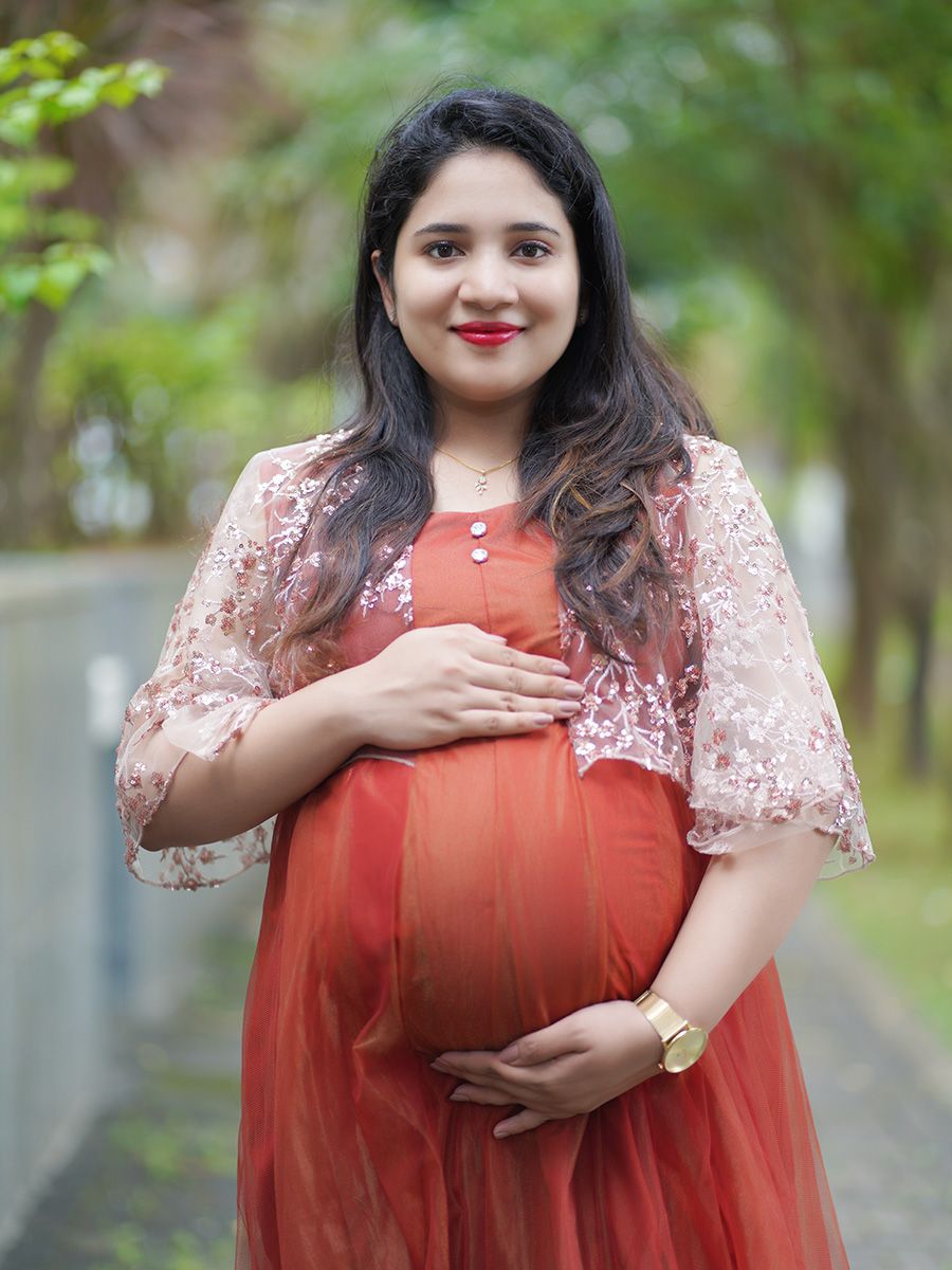 A golden brown baby shower dress ith cream color decorative net from the side front to back side through the sleeve. To white stones are attached to the centre front of the dress which enhances the beauty. The full dress is finished by joining panels which attached to the lining that gives a pretty look.