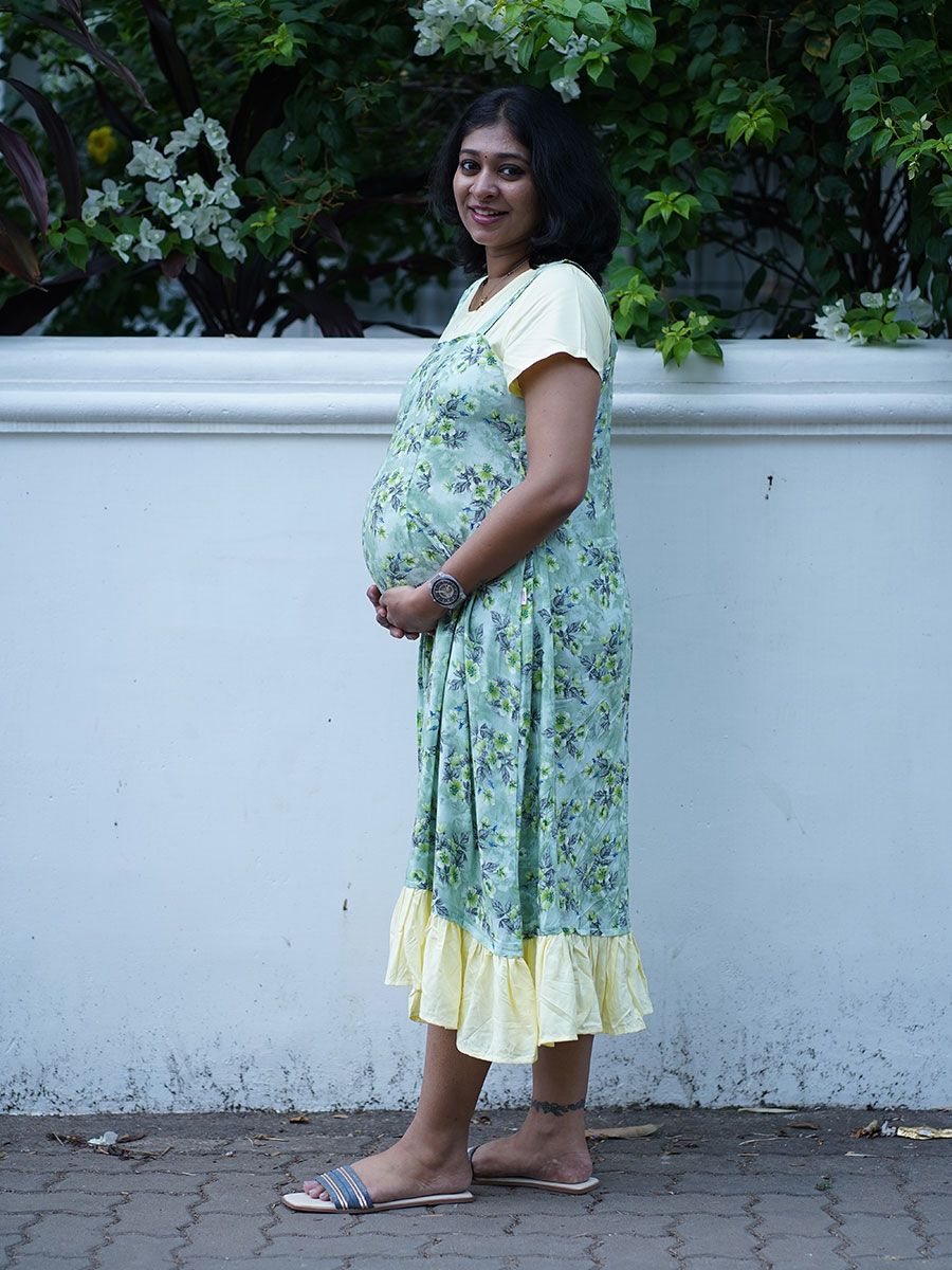 A light green color dungree style short gown. It has a round neck comes with a binding decorated with a button and a strap is attached in both shoulder. The yoke part and sleeves are attached in yellow color woven material. The bottom hem is finished with gathers in yellow color same fabric that used in yoke and sleeves. It has concealed zip opening on both sides. It is suitable for both maternity and nursing periods.