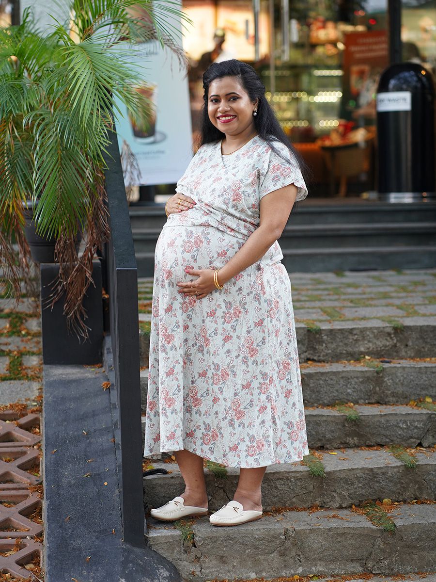A pastel green color floral printed smooth knitted wrap short dress. Easy feeding by moving front wrap area to both sides. And it was V neck with extended sleeve. The fabric is smooth and soft with gives gentle feel, it is stretchable with your baby bump.The dress gives a pretty look and comfortable feel.