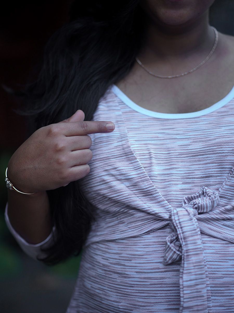 A offwhite pink printed smooth knitted tie-front short dress. Easy feeding by untie the front tie. It has round neck with contrat neck binding and 3/4th sleeve. The fabric is smooth and soft which gives a gentle feel not only that, it is stretchable with your baby bumb. The dress gives a pretty look and comfortable feel.