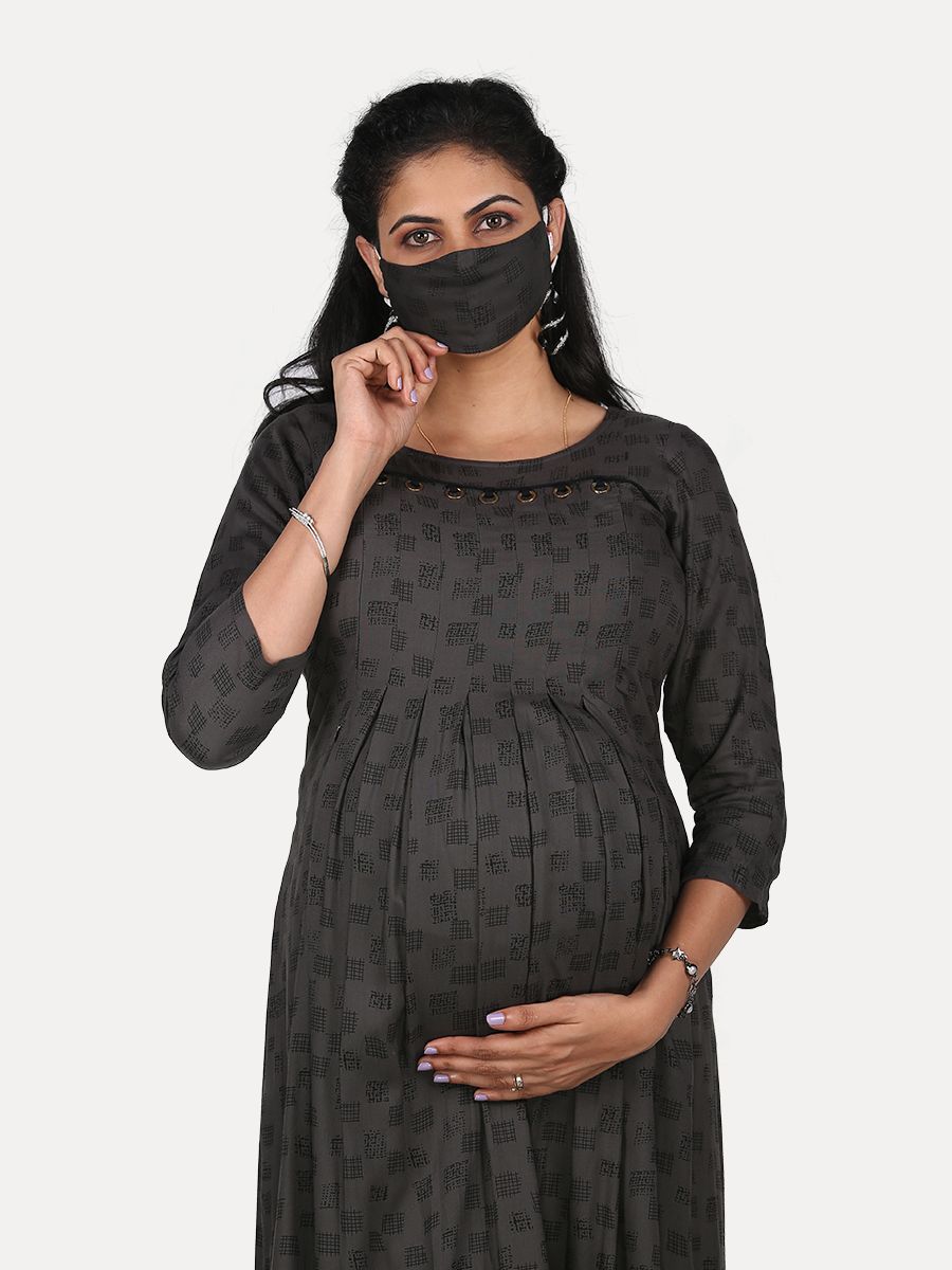 A printed calf length short dress with round neck and 3/4 long sleeve attached, yoke finished with contrast color corded piping with golden color metal rings attached on the top of inverted box pleats for aesthetic purpose. It has a concealed zip opening on both sides. It can be paired with black leggings or capri. It is suitable for both maternity and nursing periods.