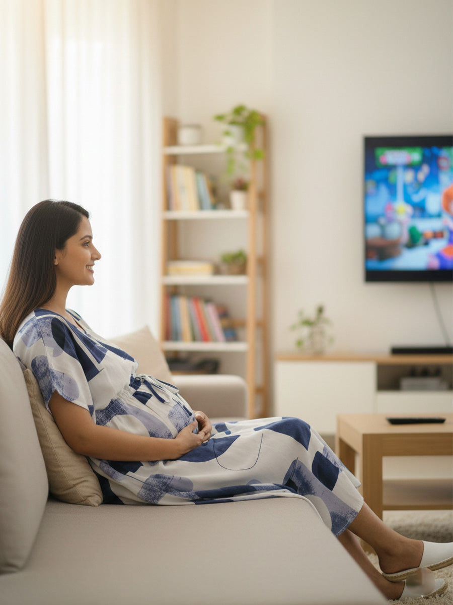 Designed for real-life motherhood, the kaftan features a flattering V-neck, wide half sleeves, and a flowy 46" length for relaxed movement. Dual concealed zips on both sides provide smooth, discreet nursing access. An attached front tie lets you adjust the fit easily as your body changes, making it suitable from pregnancy through postpartum.
