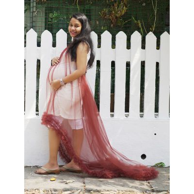 A photoshoot short sleeveless white knitted slip with strap. A brown color plain net as its over wear which is tiable on back neck.The bottom portion of the net is high-low pattern and the edge has gathers.