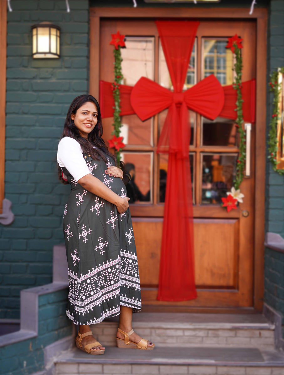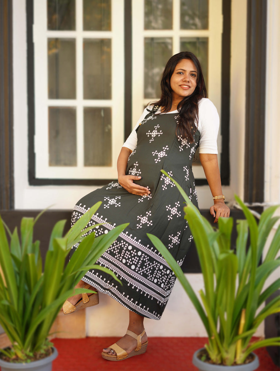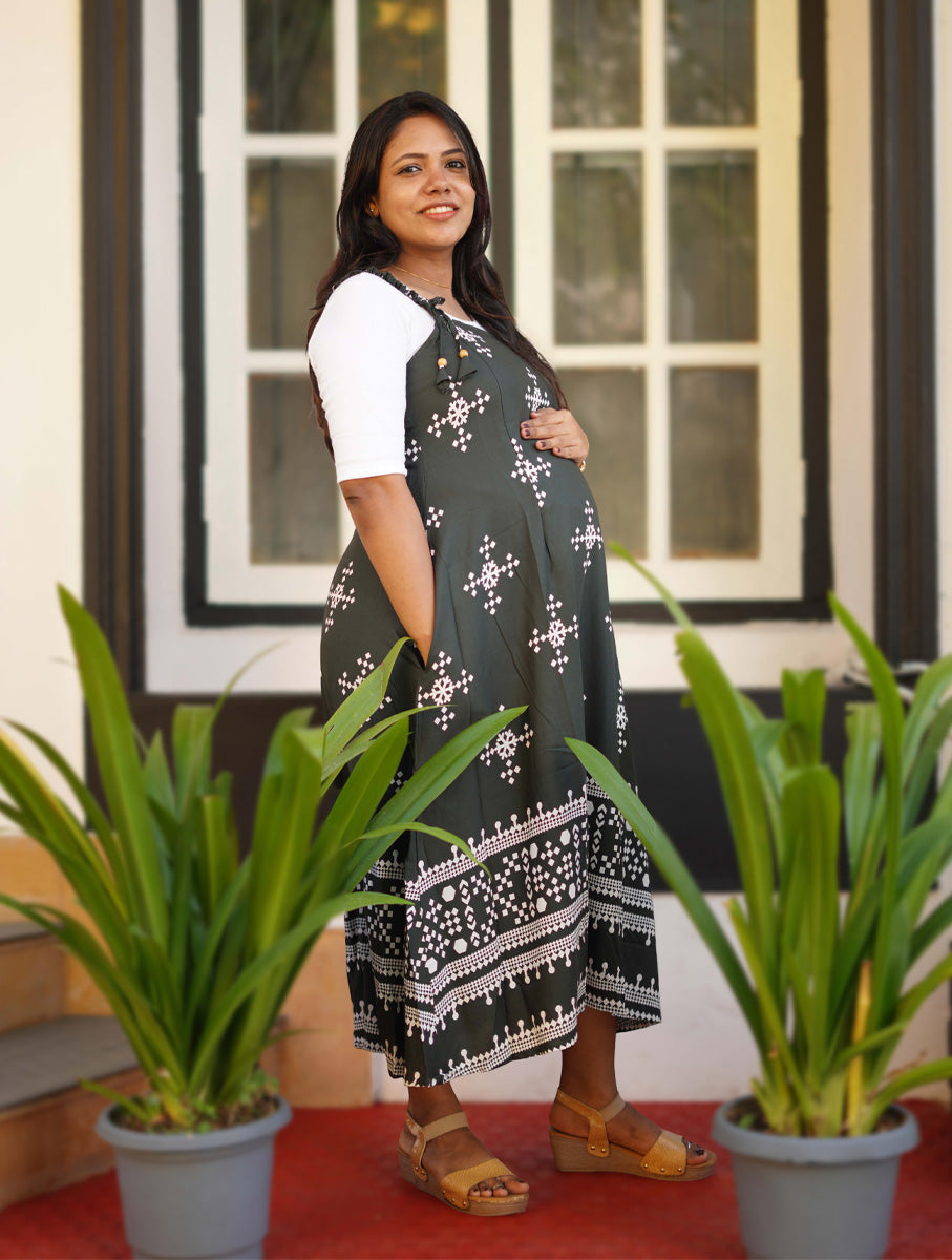 The dress has thin, adjustable shoulder straps and a relaxed fit. The tie is adorned with small wooden beads at the end. It's a feeding dress with zips on both sides. The dress has a short white inner layer gathered at the bottom with a small elastic, making it comfortable for feeding.