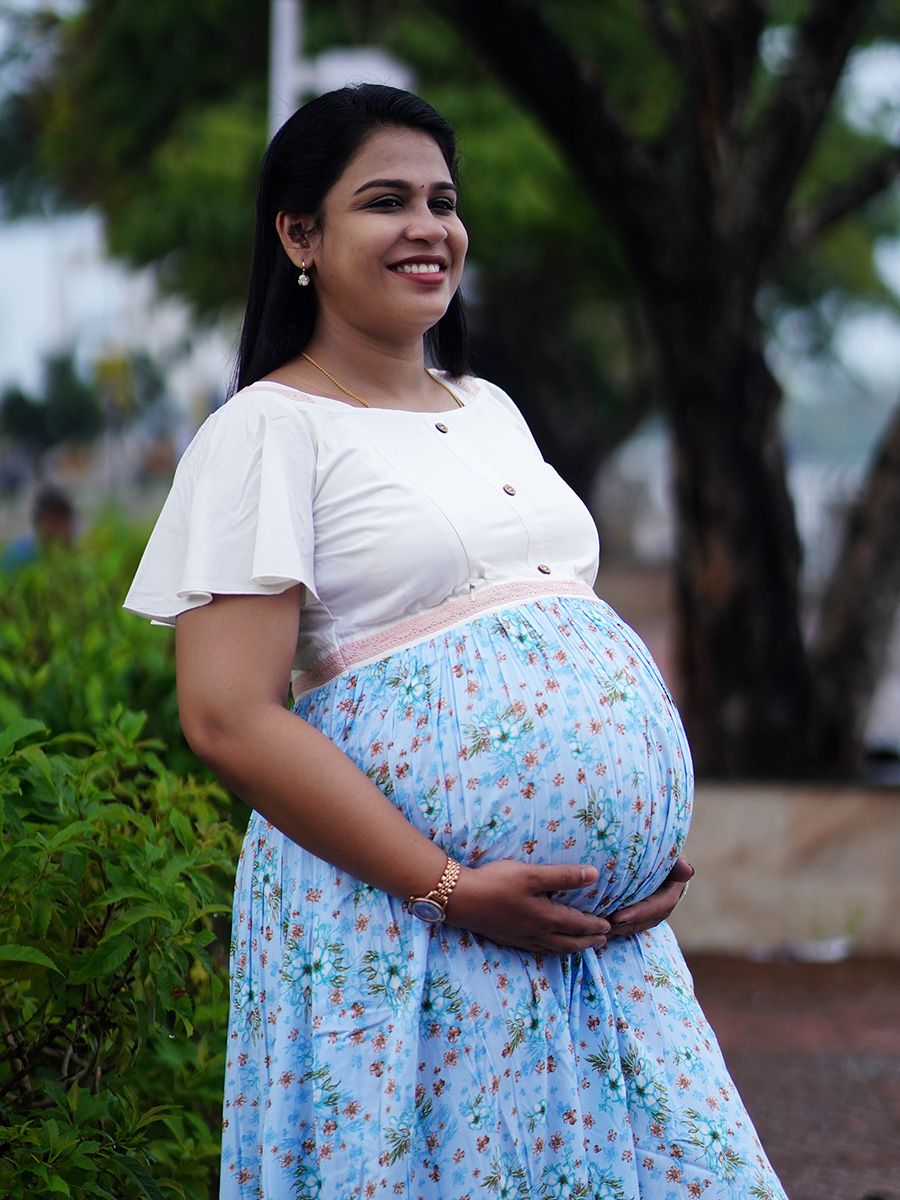 A lovely Avery Light Blue short length gown. It has a square-shaped neck with shoulder lace attached and special sleeve that is circular so as to give maximum comfort and access . The sleeve end is baby overlock. The front placket has three buttons attached. The yoke part is made of off white cotton material and the bottom part is light blue in colour. It has concealed zip opening on both sides. It is suitable for both maternity and nursing periods.