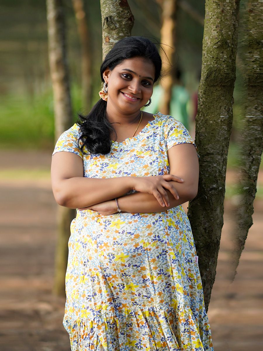 A white colour floral short night gown has a boat neck. In the neck, there is attached pleates.To get a comfort and shape there given ties.Concealed zip openings on both sides for feeding.