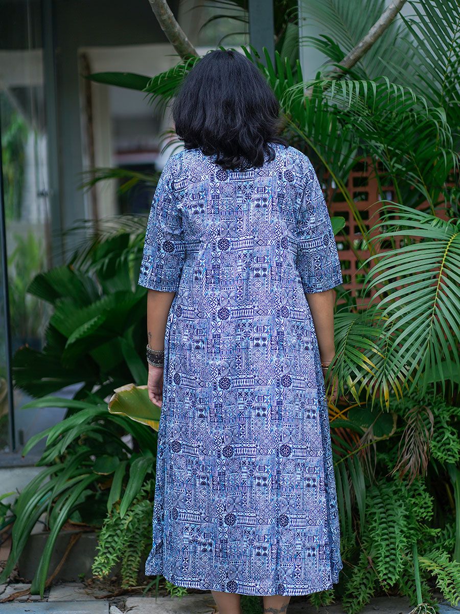 A stylish two piece offwhite color knitted midi sleeveless dress with round neck and concealed zip opening on both sides for feeding, and it has a seperate woven light blue color collared Jacket with loop and button an it has 3/4th short sleeves .This garment is suitable for both maternity and nursing periods.