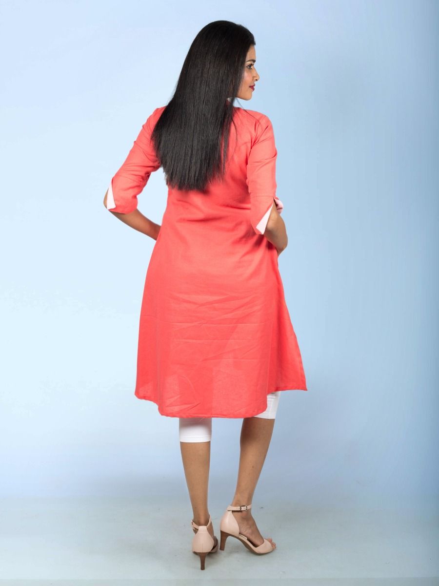 A cotton fabric casual long top with chinese collar and flapped 3/4th sleeve with button embellishment. Loops and balls attached to the neck for aesthetic purpose. Pockets attached on both the sides for completing the look. Concealed zip opening is attached on both sides are suitable for both maternity and nursing period.