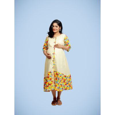 A cotton calf length top, round neck with attached decorated placket and 3/4th sleeve. It has a plain body with abstract printed bottom and sleeve. It has a concealed zip opening on both sides. It is suitable for both maternity and nursing periods.