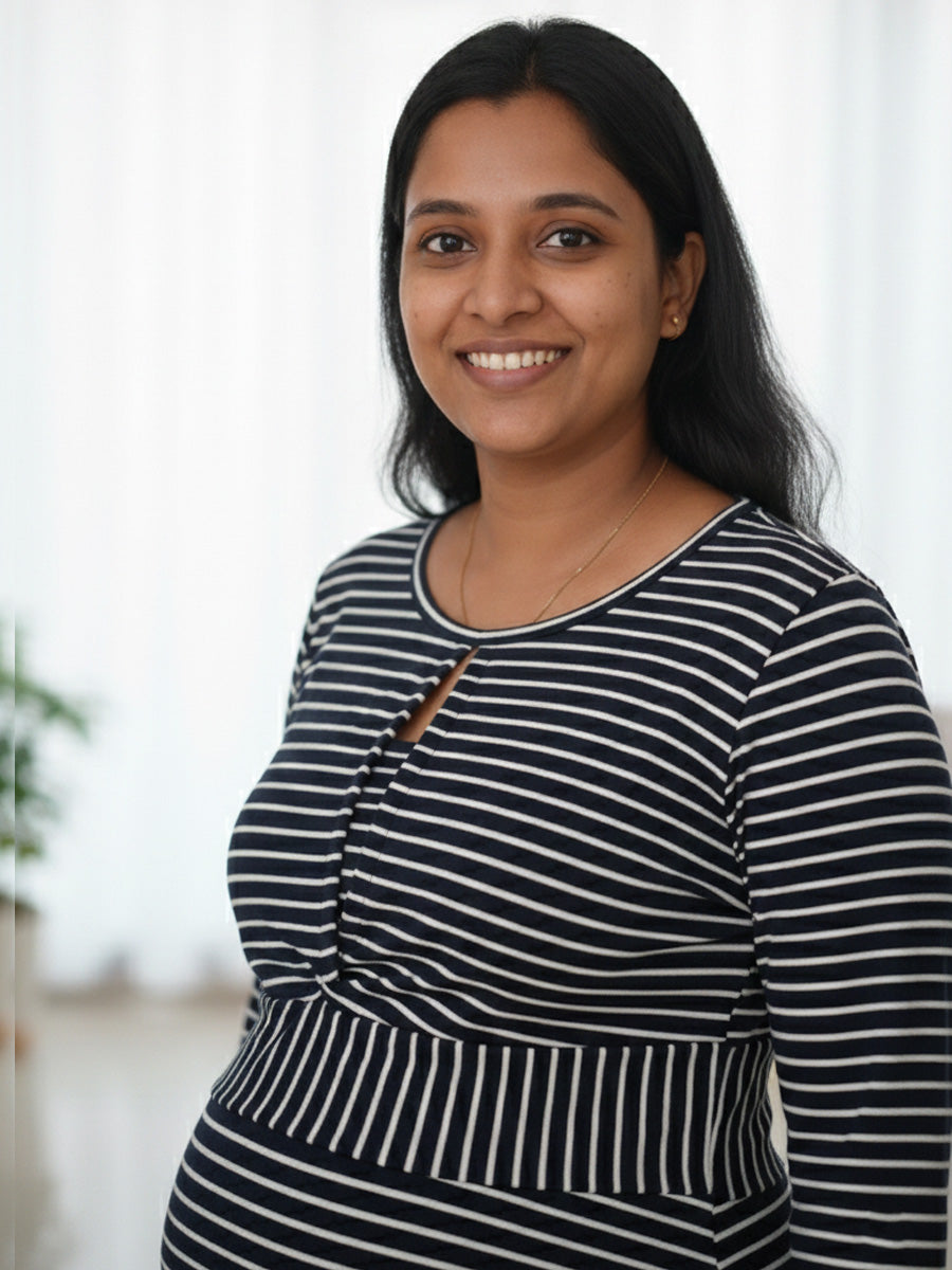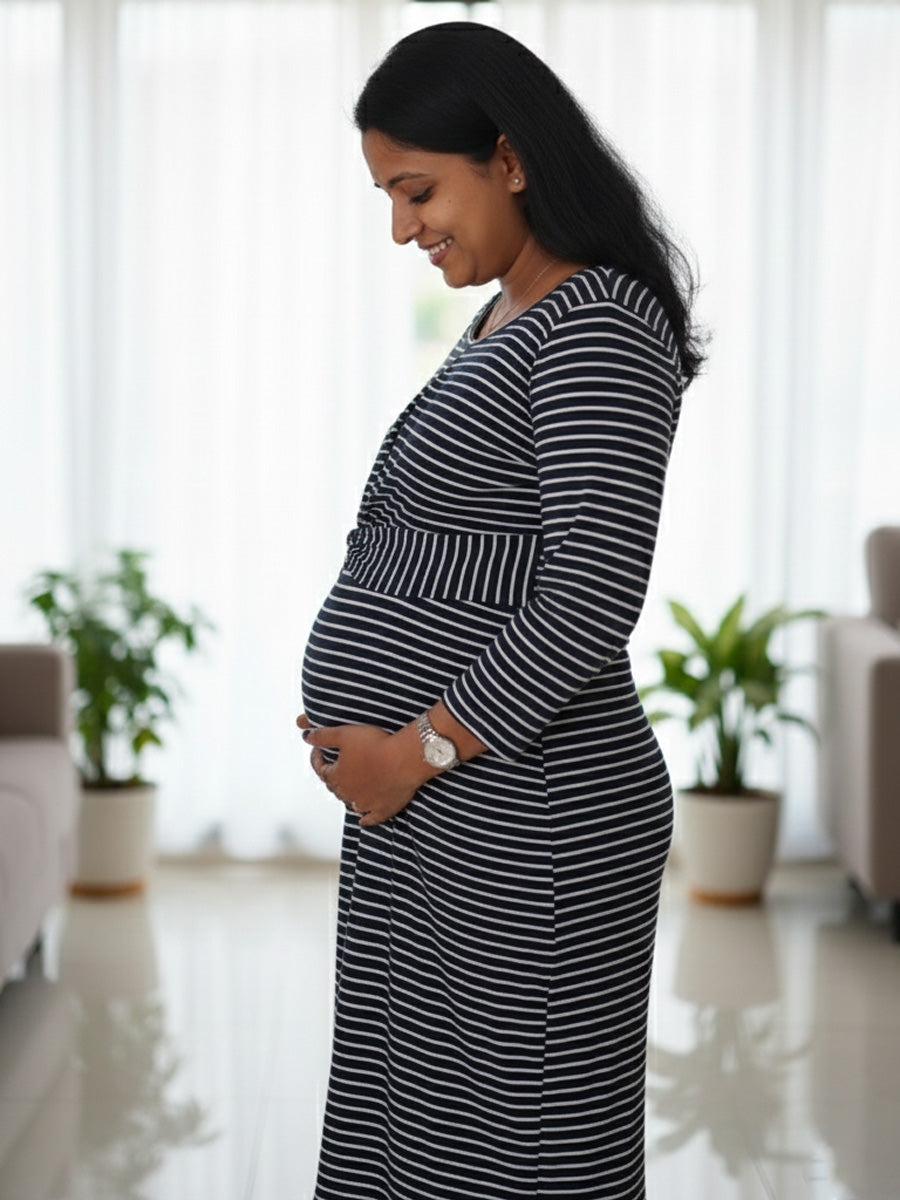 Classic, chic, and effortlessly flattering — this Navy Blue Knitted Twisty Zipless Maternity Dress is crafted for moms who love comfort with style. Made in a soft knitted fabric with clean white stripes, it offers a body-contouring, flexible fit that adapts beautifully through every trimester.