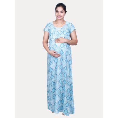Printed full night gown with round neck and short sleeve, the yoke is attached with a cape of box pleat and pleats with decorative stitch and it's use cover the concealed zip opening. It is suitable for both maternity and nursing periods.