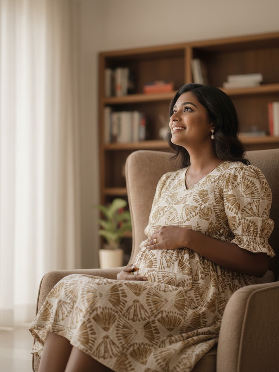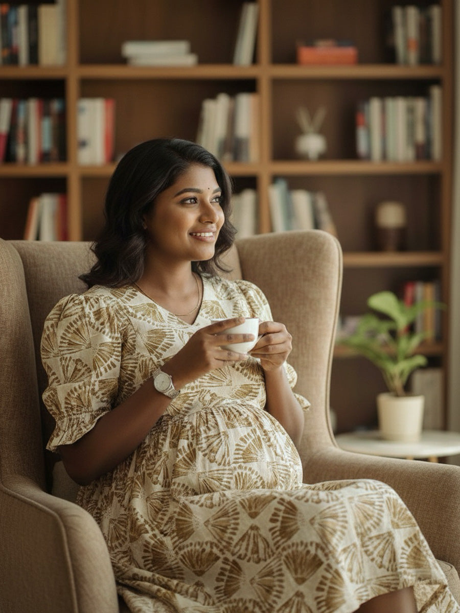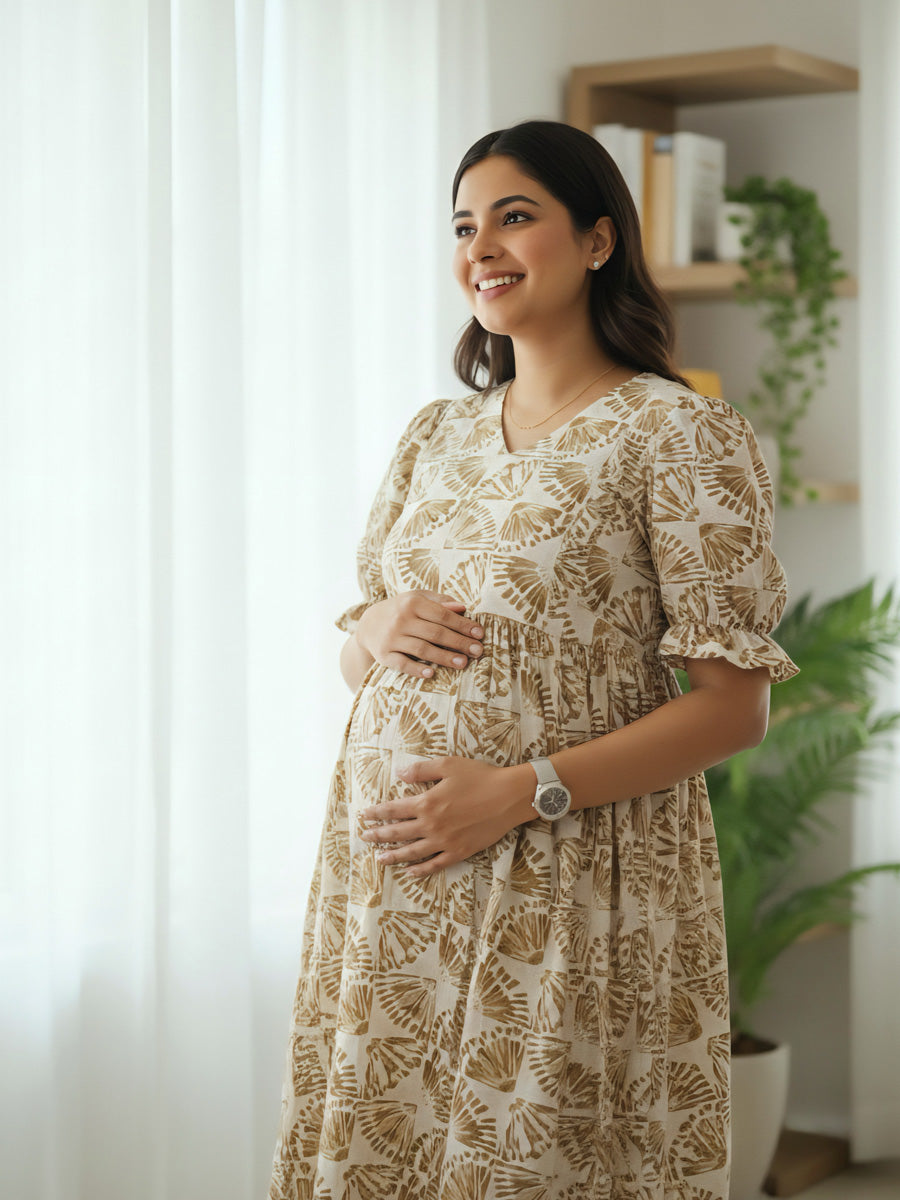 Experience effortless comfort with Ziva’s Off-White & Pastel Olive Floral Block Print Maternity & Nursing Dress—crafted to support you beautifully through pregnancy, postpartum, and breastfeeding.