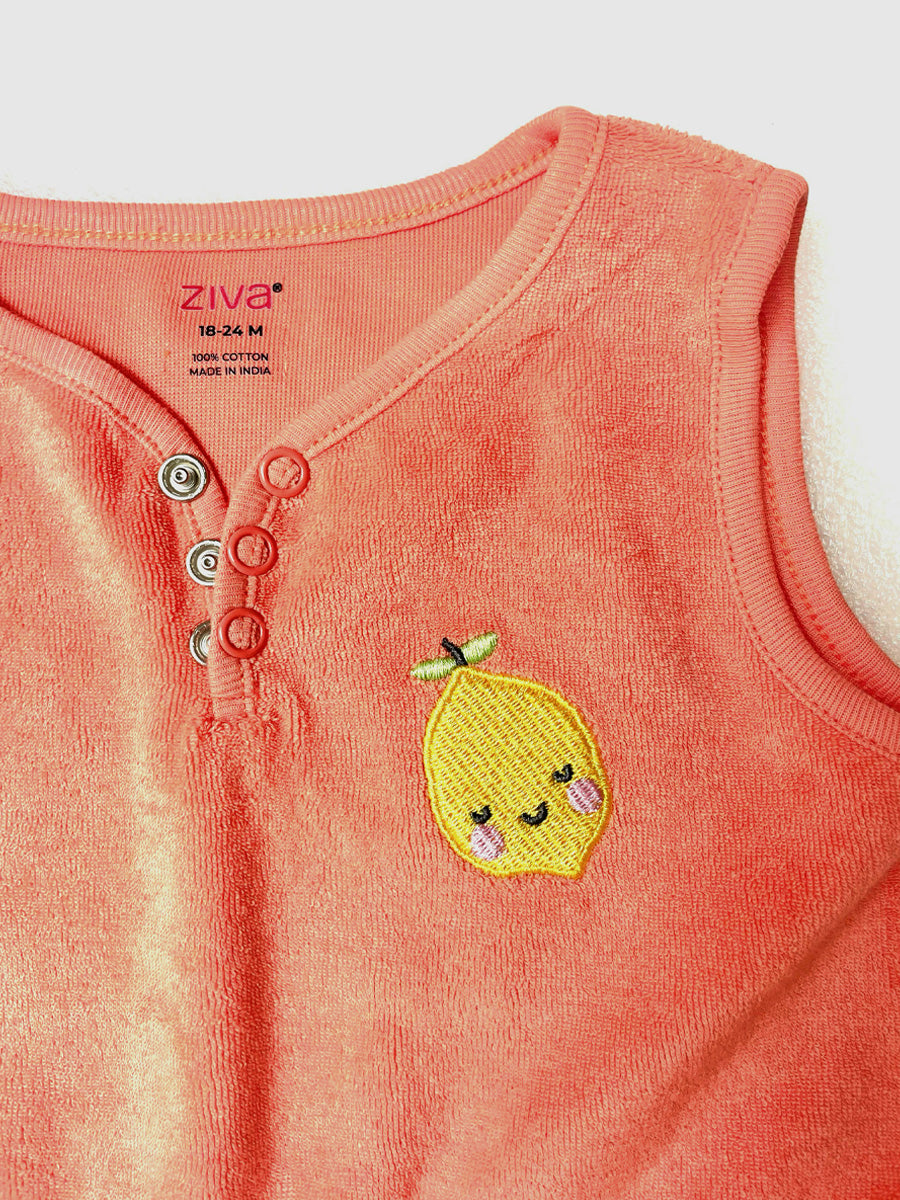 Add a splash of sweetness to your little one’s wardrobe with the Ziva Little Lemon Peach Terry Jumpsuit. Crafted from super-soft and stretchy terry cloth, this sleeveless jumpsuit is designed to keep your baby comfortable all day long.