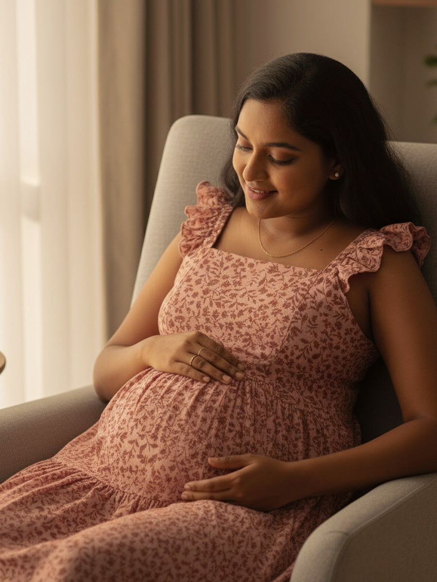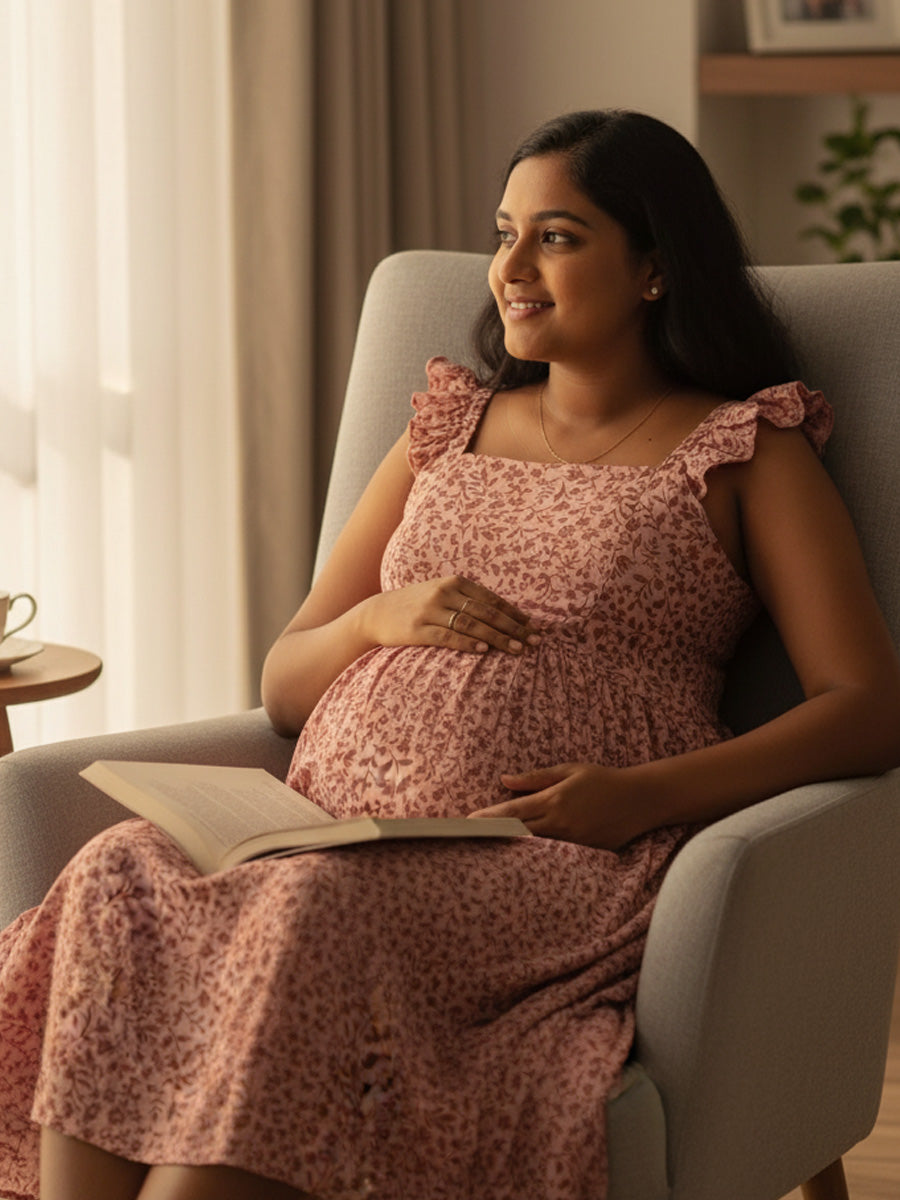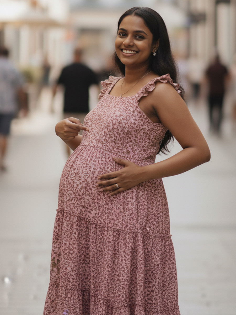 Bring softness and charm to your maternity wardrobe with this Pink Floral Muslin Nursing Dress, designed for effortless style and feeding comfort. Made from lightweight, breathable muslin, it features delicate multi-layered ruffle butterfly sleeves and a flattering square neckline that gives a graceful, feminine silhouette.