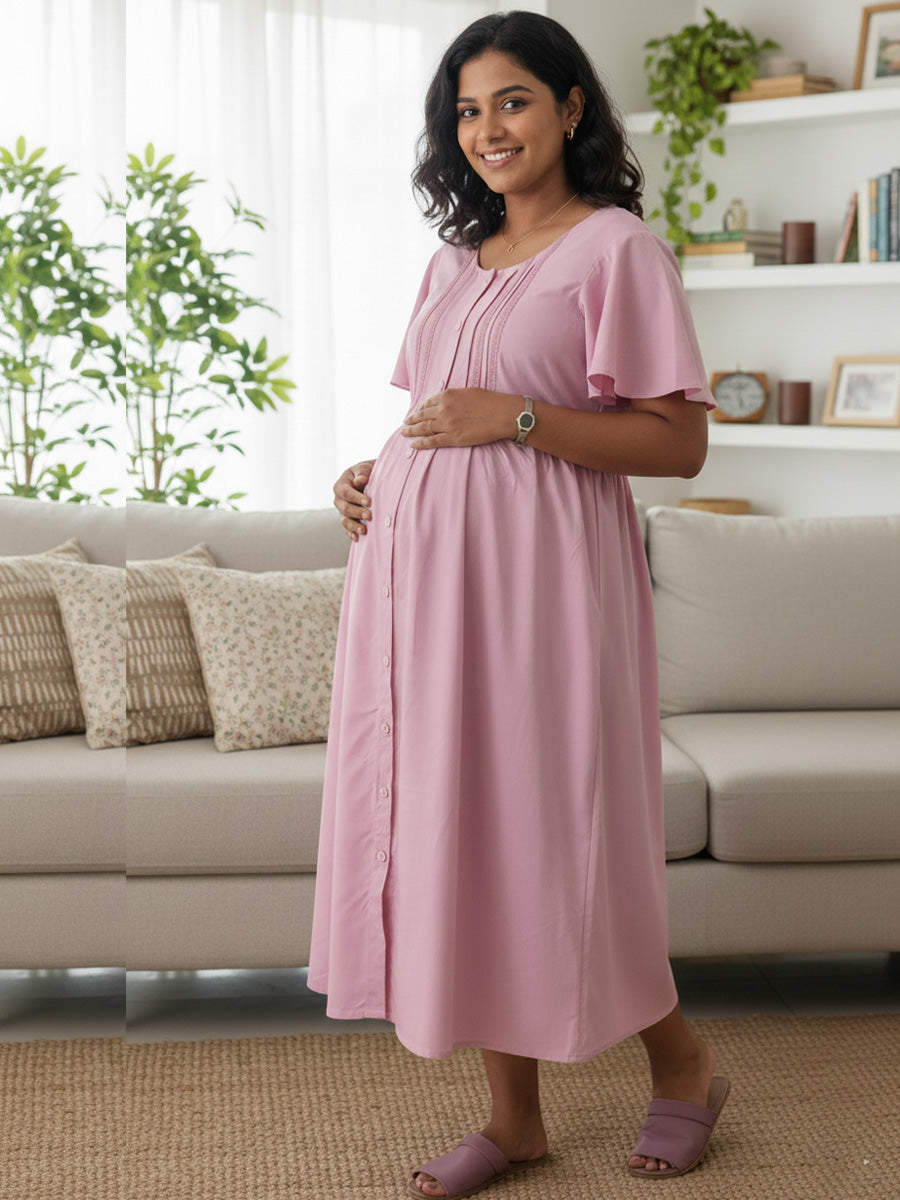 This elegant pink full-open short maternity and feeding nighty is designed for comfort, ease, and everyday practicality. The A-line silhouette features matching buttons on the front, paired with delicate lace detailing on the yoke for a soft and feminine touch.