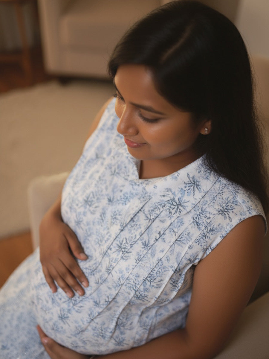 Stay comfortable and stylish in this sleeveless cotton collar cord set made from breathable 100% cotton. Features self-print, dual nursing zips, pockets, and matching bottoms—perfect from pregnancy to feeding time for casual and everyday wear.