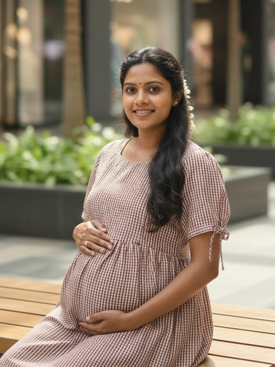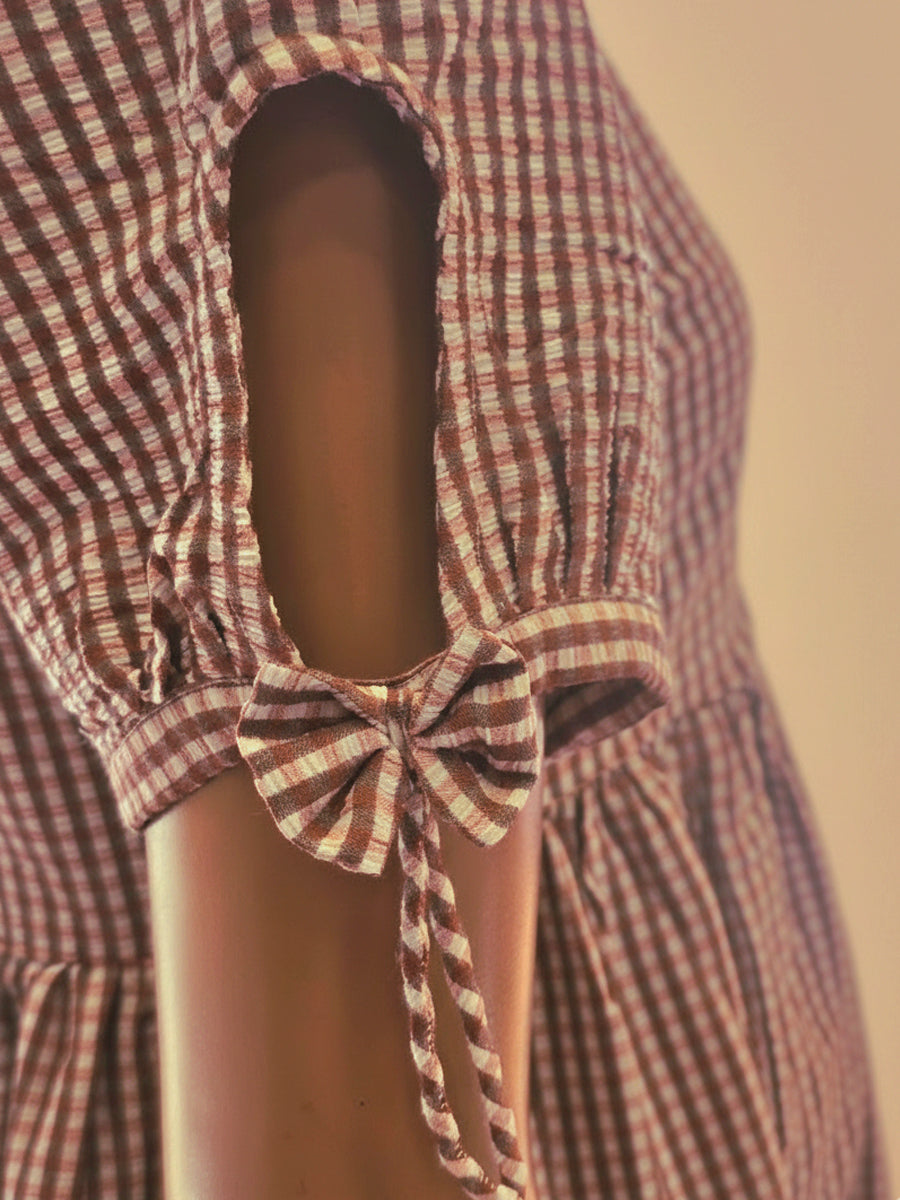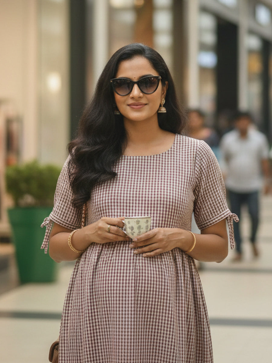 Designed for modern moms who love comfort with style, this Treny maternity and feeding dress is crafted from lightweight mixed cotton seersucker fabric that feels airy and breathable all day long. Featuring an all-over light cocoa brown and cream gingham print, it offers a timeless yet trendy look.