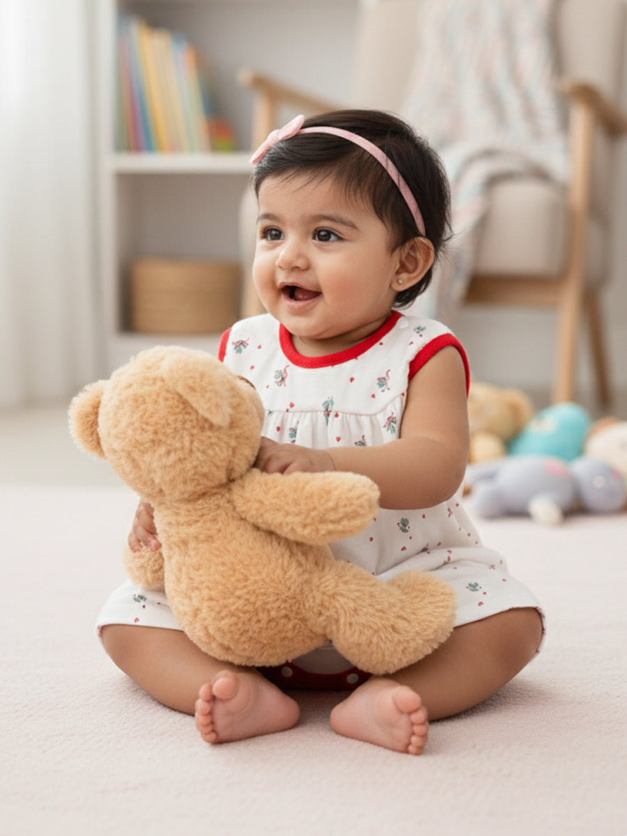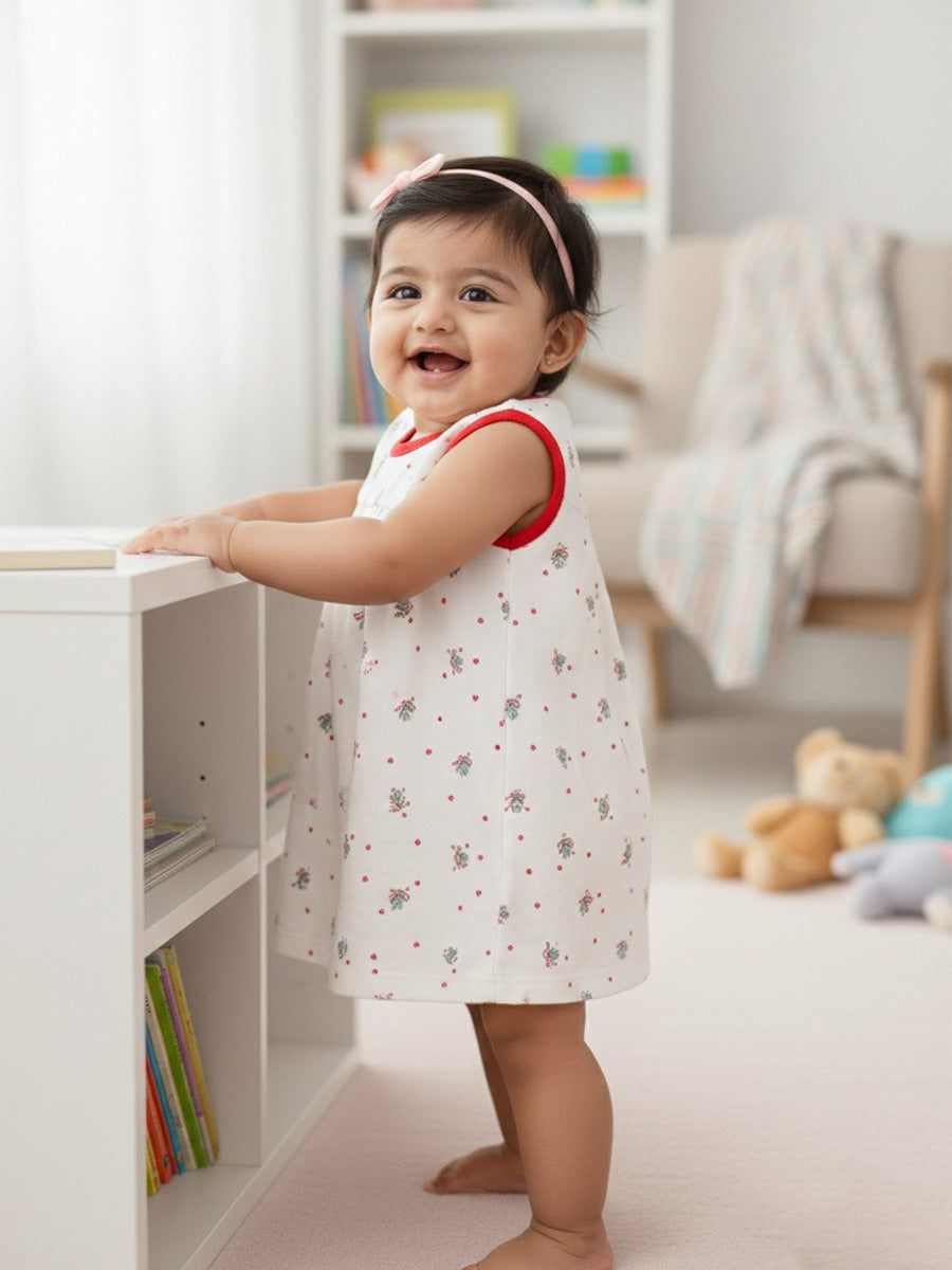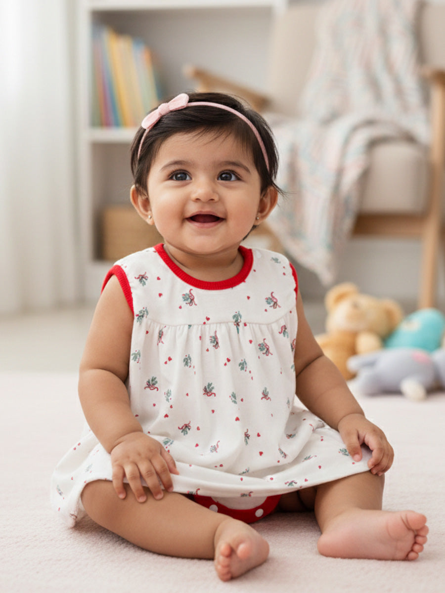 Designed with comfort and convenience in mind, the dress comes with an attached inner bloomer featuring elasticated leg openings and two white snap buttons at the crotch for quick and easy diaper changes. Its simple A-line or gathered silhouette ensures free movement, making it ideal for active infants.