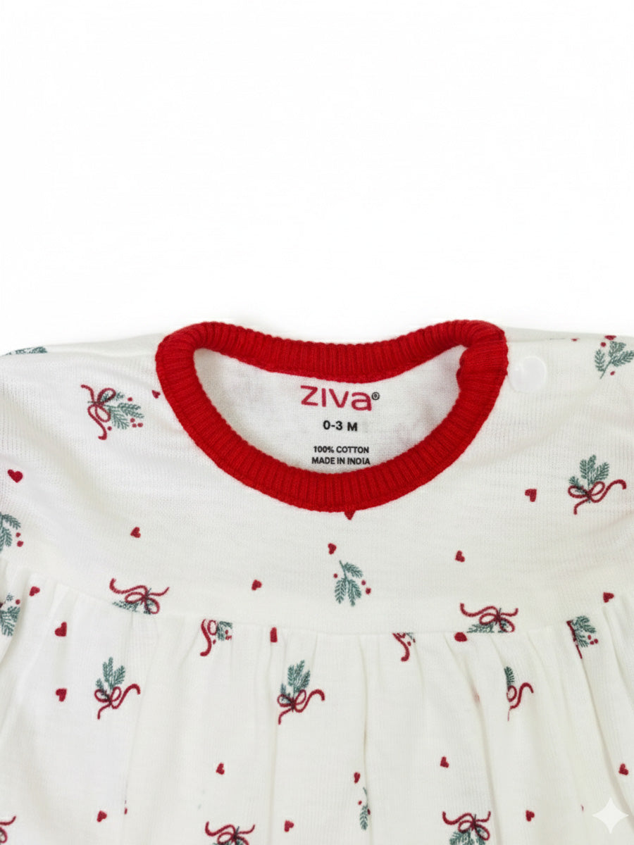 This adorable Christmas dress is perfect for your little girl’s festive celebrations. Made from soft knitted fabric, the dress features a charming white base with Christmas bow prints that give it a cheerful holiday look. The sleeveless design includes a rounded neckline and bright red binding around the armholes and neck for a beautiful contrast.