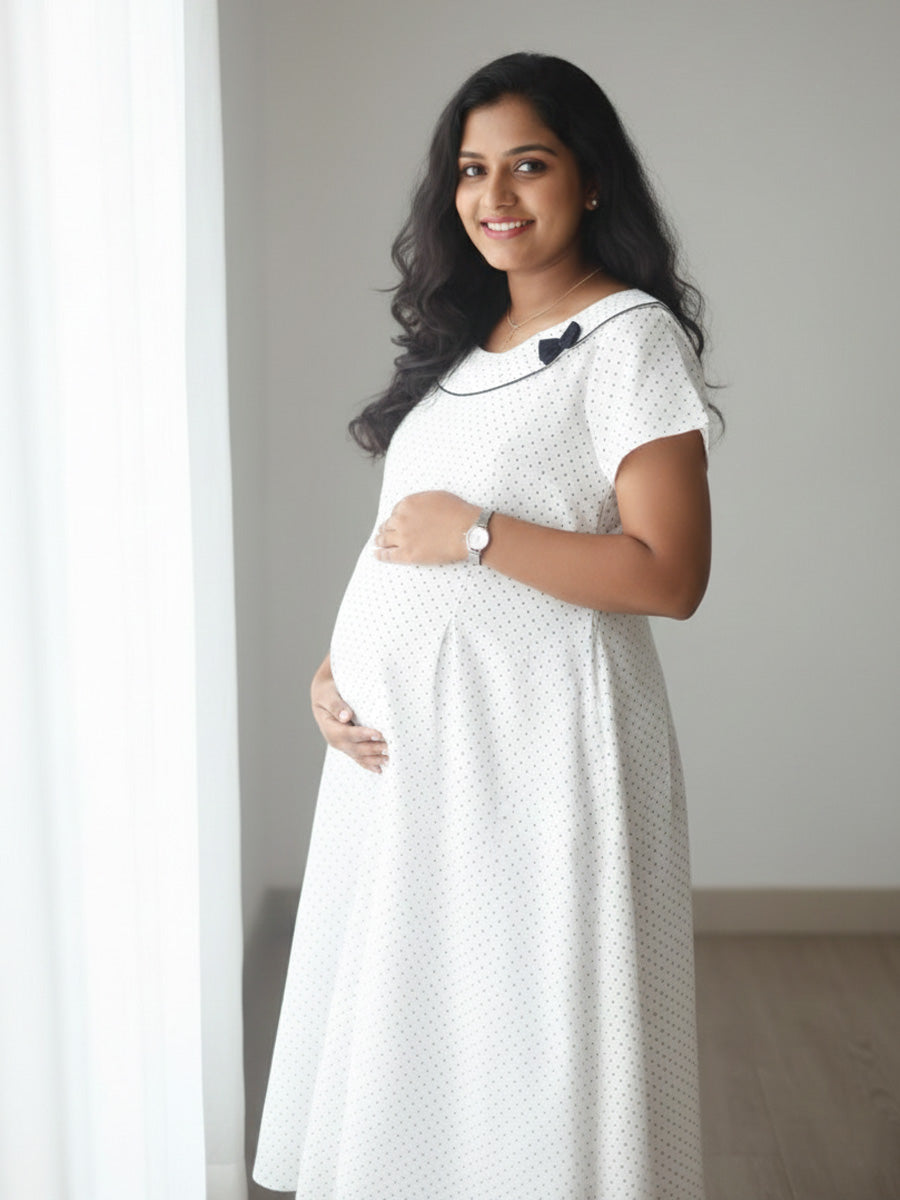 Stay comfortable, cute, and confidently prepared for feeding time with this white cotton polka dot feeding nighty from Ziva. Designed in soft breathable cotton, it features a charming round Peter Pan collar with a delicate bow detail for an elegant touch.