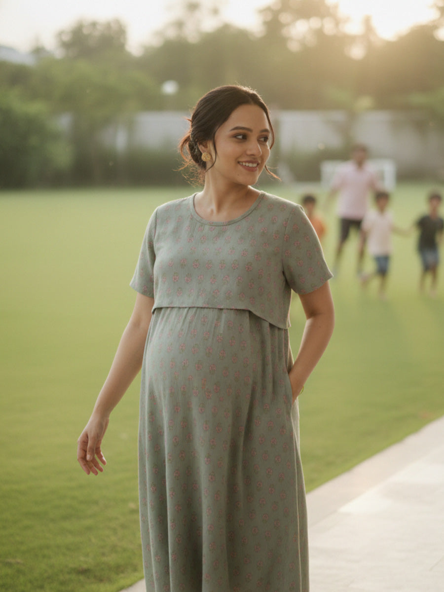 Featuring a classic round neckline, the olive green base is enhanced with an all-over floral print for a timeless, graceful look. The zipless feeding design allows easy access by simply lifting the flap portion—eliminating the need for zips or fasteners. With a relaxed yet flattering silhouette, this dress comfortably accommodates a growing baby bump, making it ideal for daily home wear.