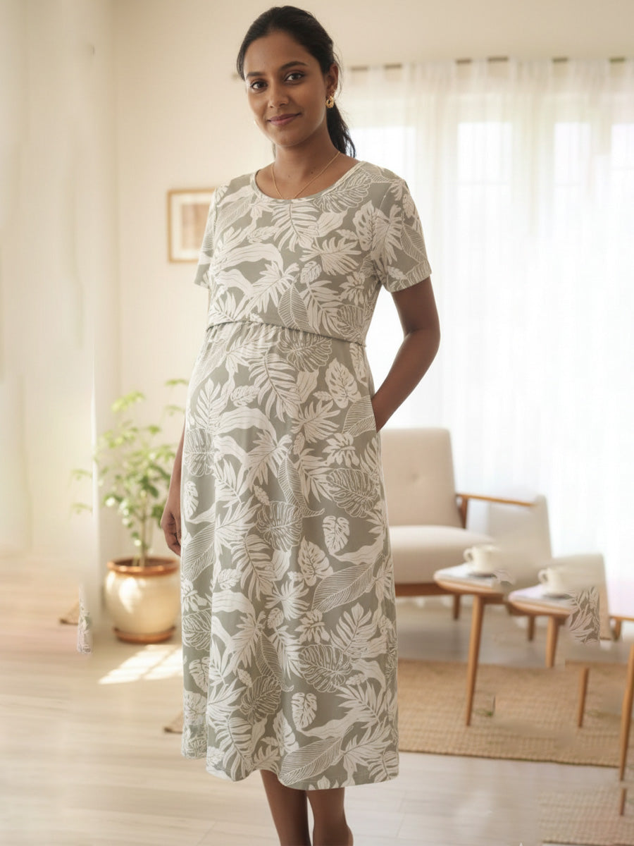 Featuring a classic round neckline, the soothing sage green base is enhanced with an all-over tropical leaf print for a fresh, natural look. The zipless feeding design allows easy and discreet access through a smartly placed flap. Adjustable tie-ups ensure a customizable fit as your body changes, while a functional pocket adds everyday convenience. Perfect for accommodating a growing baby bump with a relaxed yet flattering silhouette.