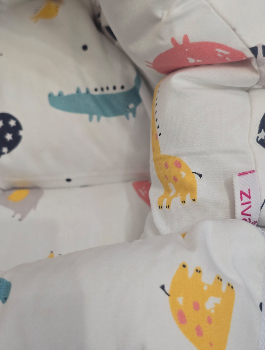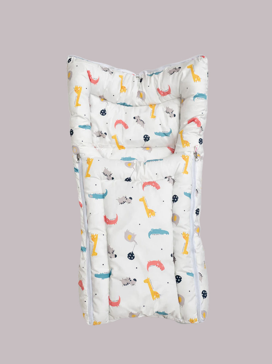 Versatile and practical, this product can be used as a carry nest, a cozy sleeping bag, or a comfortable mattress. Made from 100% soft cotton with an adorable cartoon animal print on white fabric, it keeps your baby warm, cozy, and secure throughout the day.