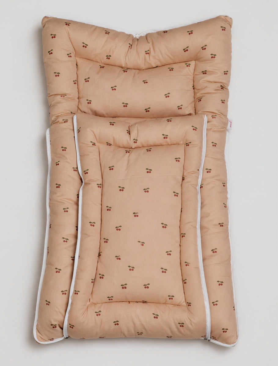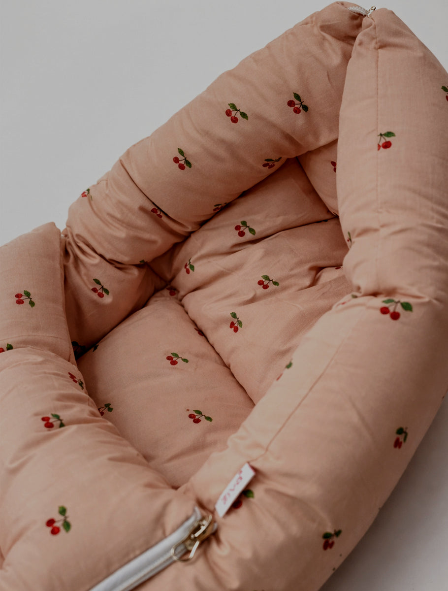 Versatile and practical, this product can be used as a carry nest, a cozy sleeping bag, or a comfortable mattress. Made from premium organic cotton with a charming cherry print in a soothing brown colour, it keeps your baby warm, cozy, and secure all day long.