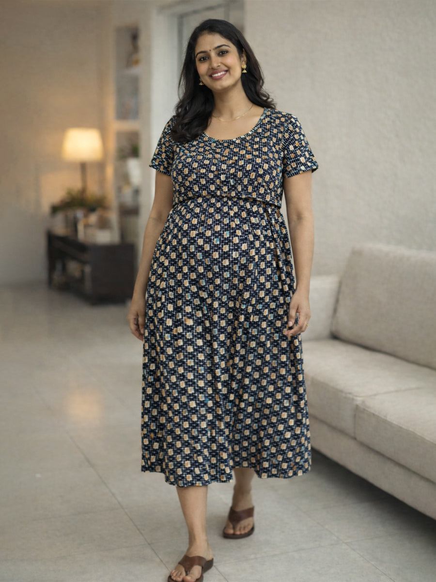 The elegant light cream base with modern abstract prints in black, mustard beige, and grey blue gives a stylish everyday look. The gathered waistline with adjustable tie ensures a flexible fit, while the smart zipless nursing flap provides easy and discreet feeding access.