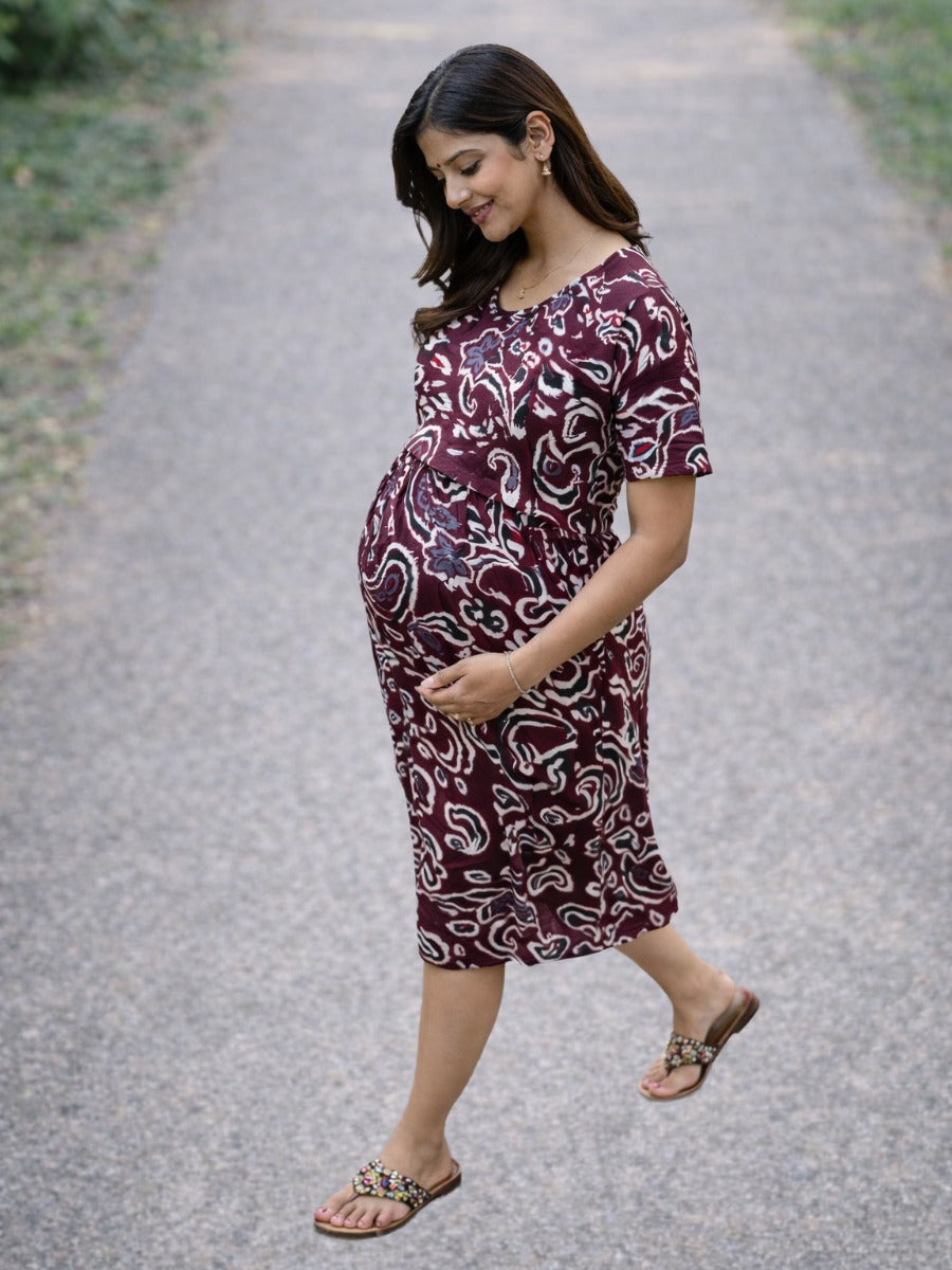 The zipless feeding flap allows easy and discreet breastfeeding anytime. Featuring a rich maroon base with vibrant abstract paisley prints in brown, burgundy, and cream, short sleeves, and a round neckline, the dress delivers a timeless and flattering look. The gathered waistline with adjustable tie ensures a relaxed, flowy fit that adapts to your growing baby bump.