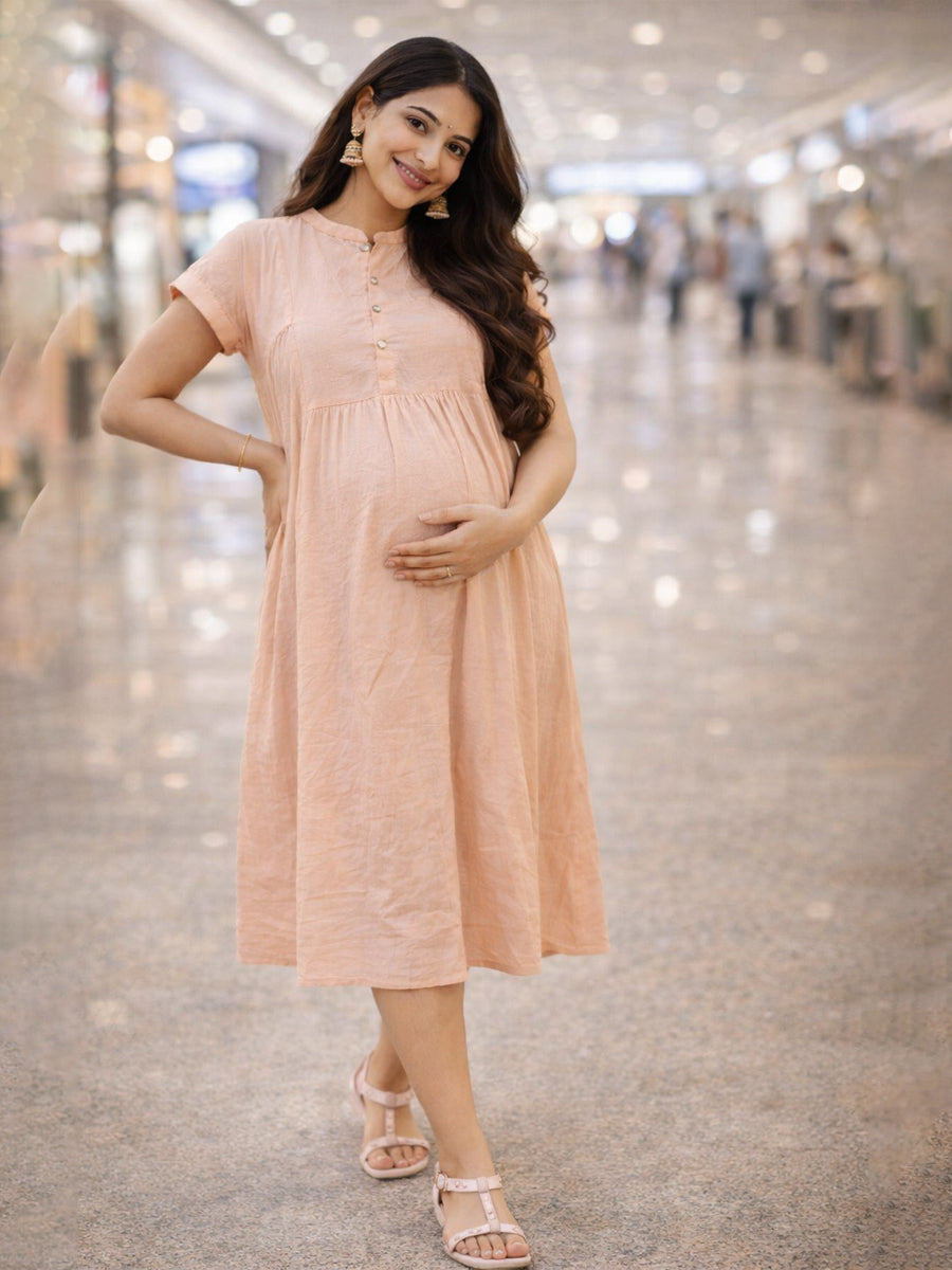Introducing the elegant Peach Pink Maternity & Nursing Dress from Ziva Maternity Wear – thoughtfully designed for expecting and feeding mothers who love comfort with style.