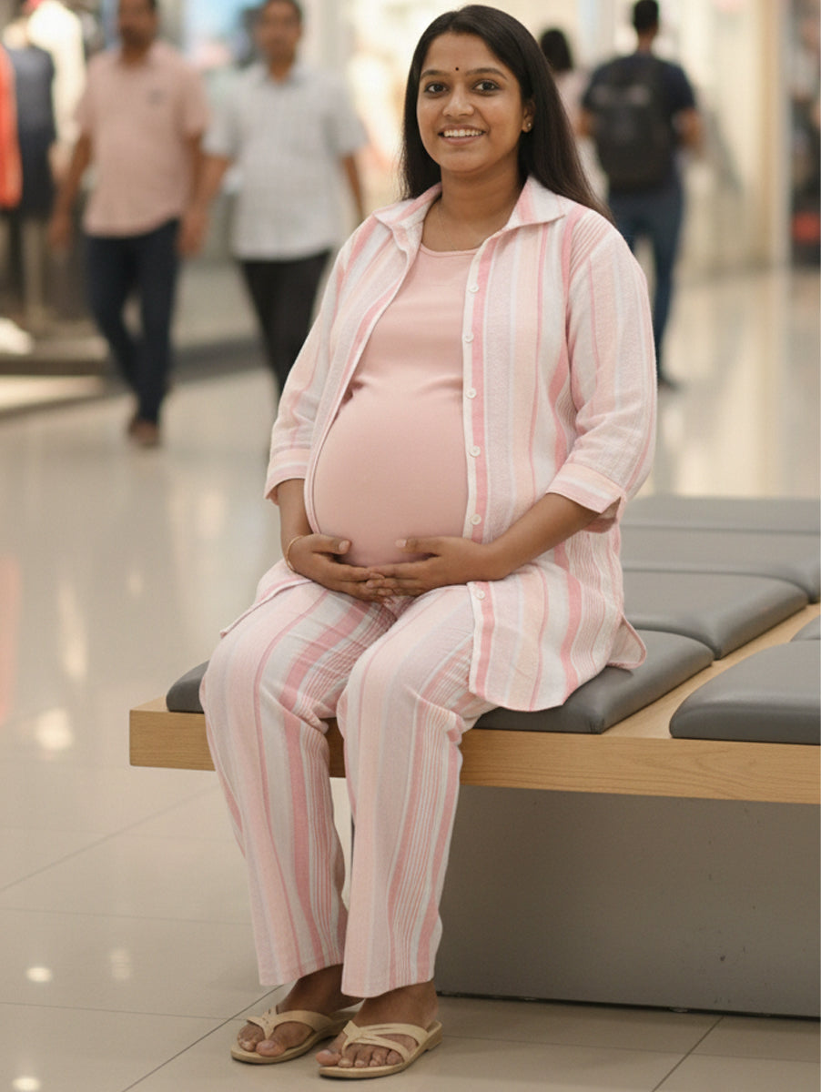 Experience the perfect blend of comfort and style with the Ziva Pink & Peach Striped Maternity Co-ord Set.