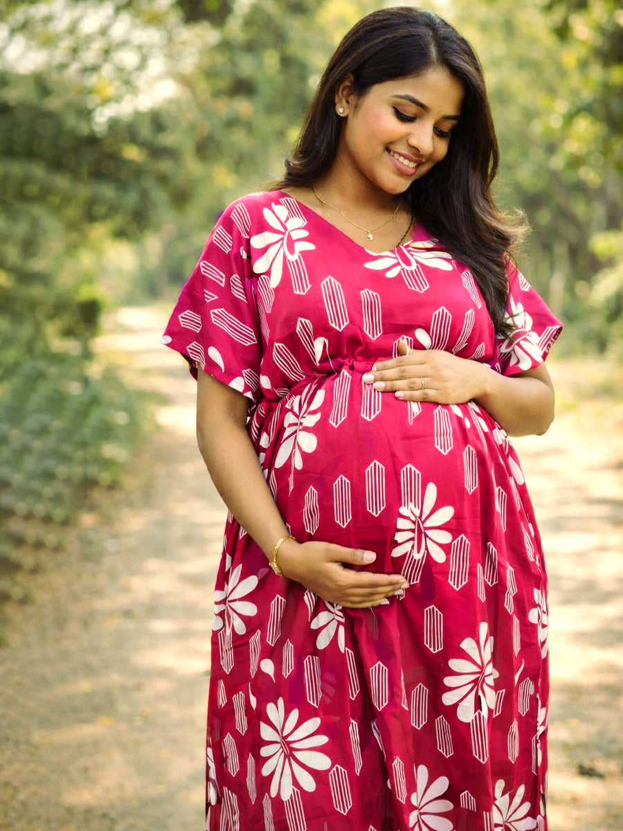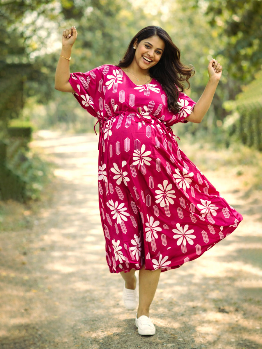 Introducing the Ziva Rani Pink Floral Maternity & Feeding Kaftan, designed for moms who love comfort with style. This elegant kaftan features a vibrant rani pink base adorned with delicate white floral prints, creating a fresh and trendy look perfect for every stage of motherhood.